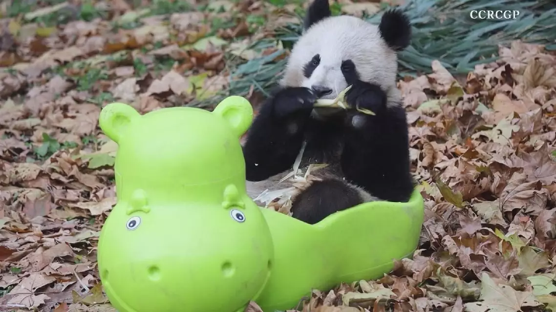 In the footage, panda cub Fei Hong sits snugly inside the small, green hippo-shaped toy. As she munches on a tender bamboo shoot, her calm and contented demeanor shines through, capturing a peaceful moment of play and nourishment.