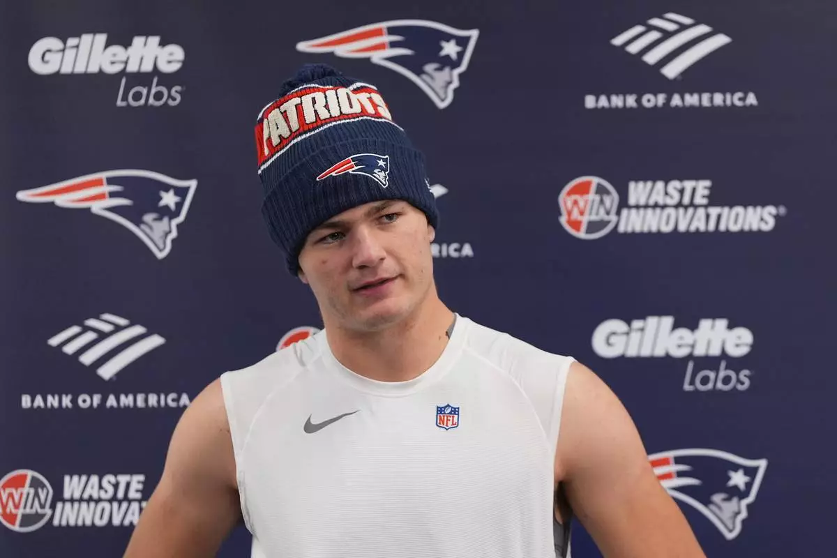 New England Patriots quarterback Drake Maye speaks at a news conference after an NFL football game against the Baltimore Ravens, Sunday, Dec. 21, 2025, in Baltimore. (AP Photo/Stephanie Scarbrough)