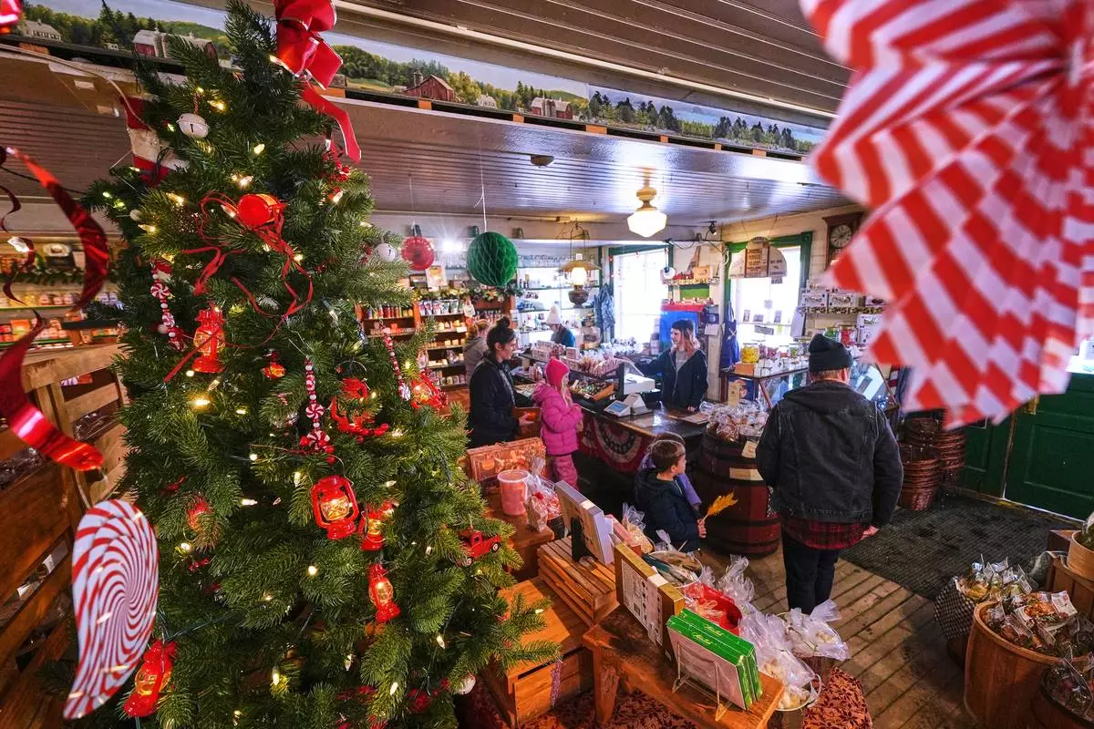 Post-holiday shoppers pass a Christmas tree and festive display at Calef's Country Store, Friday, Dec. 26, 2025, in Barrington, N.H. (AP Photo/Charles Krupa)