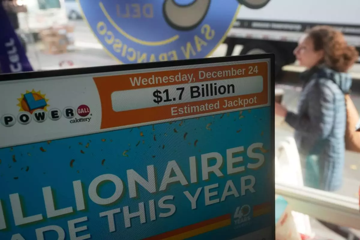 Pedestrians walk past a sign showing the Powerball jackpot of over one billion dollars at Rossi's Deli in San Francisco, Wednesday, Dec. 24, 2025. (AP Photo/Jeff Chiu)