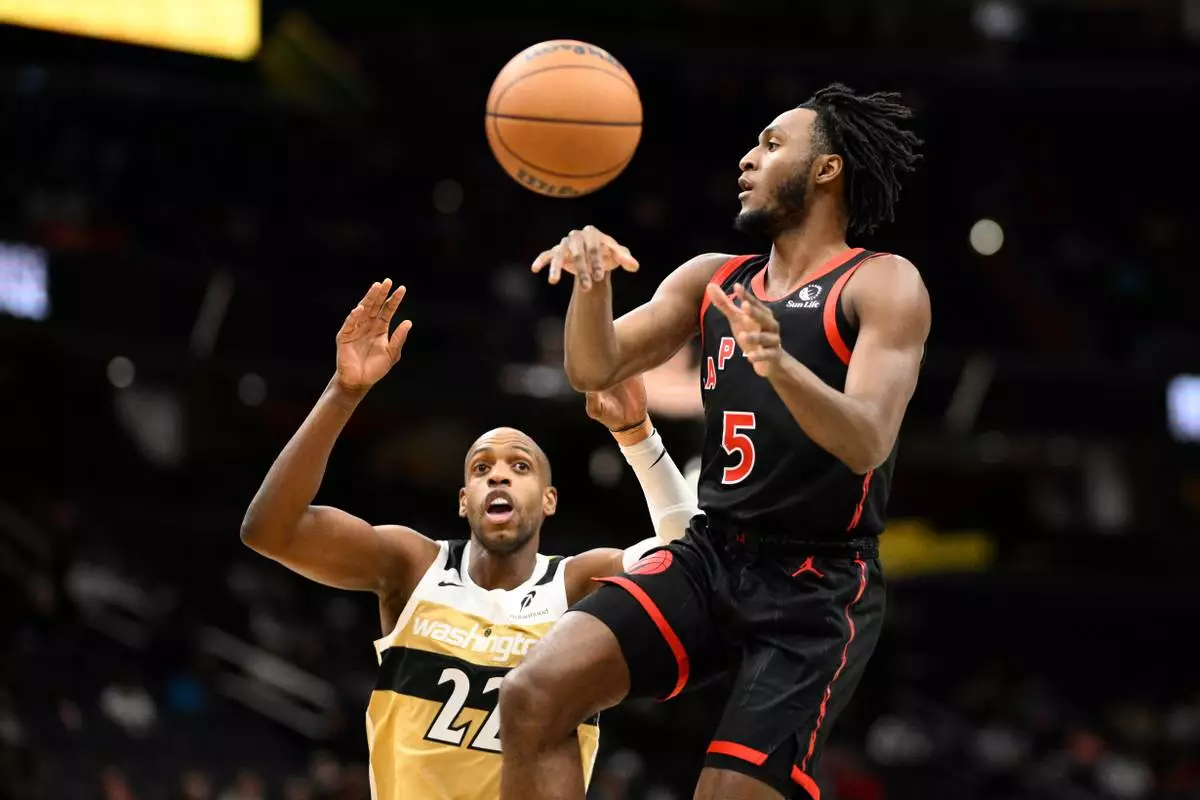 Toronto Raptors guard Immanuel Quickley (5) passes the ball against Washington Wizards forward Khris Middleton (22) during the first half of an NBA basketball game, Friday, Dec. 26, 2025, in Washington. (AP Photo/Nick Wass)