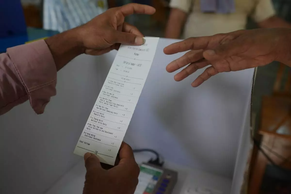Officials of the Union Election Commission show a test slip of electronic voting machine as they prepare to set up a polling station opened at a school one day ahead of the first phase of the general election in Yangon, Myanmar, Saturday, Dec. 27, 2025. (AP Photo/Thein Zaw)