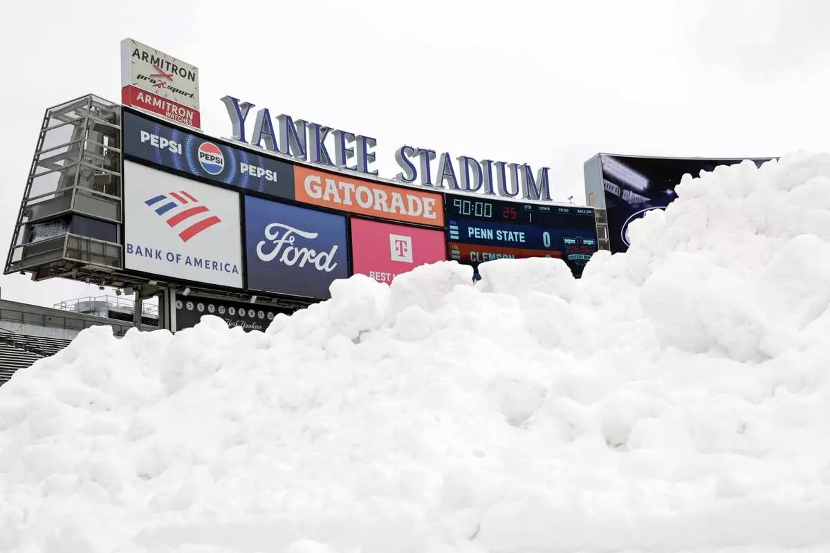 Snow is seen piled up on the field before the Pinstripe Bowl NCAA college football game between Clemson and Penn State at Yankee Stadium Saturday, Dec. 27, 2025, in New York. (AP Photo/Adam Hunger)