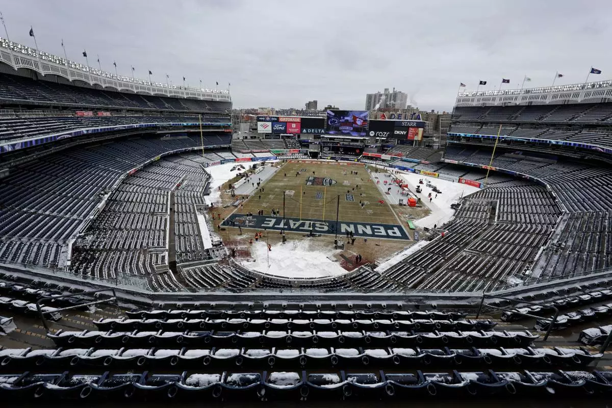 A general view of snow covered seats are seen before the Pinstripe Bowl NCAA college football game between Clemson and Penn State at Yankee Stadium Saturday, Dec. 27, 2025, in New York. (AP Photo/Adam Hunger)