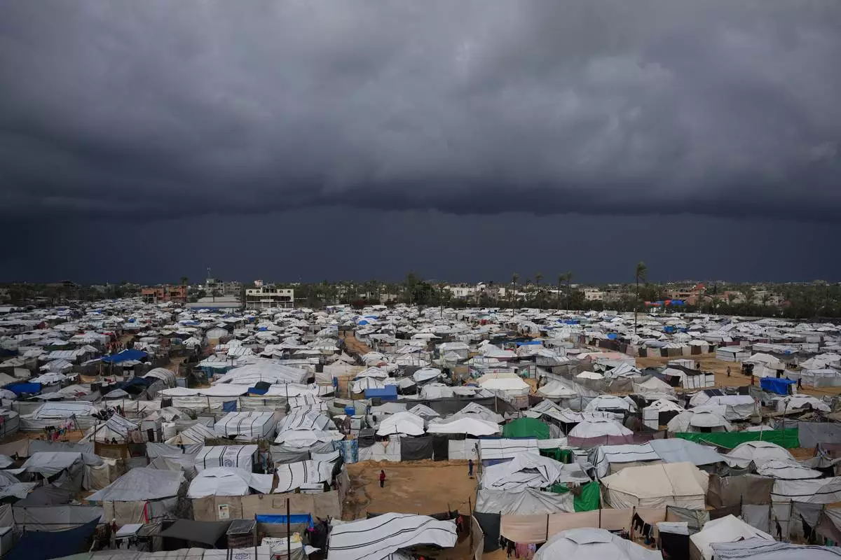DEIR AL-BALAH, Gaza Strip (AP) — Barefoot children played on chilly sand as Gaza ’s thousands of displaced people prepared threadbare tents on Saturday for another round of winter rain.