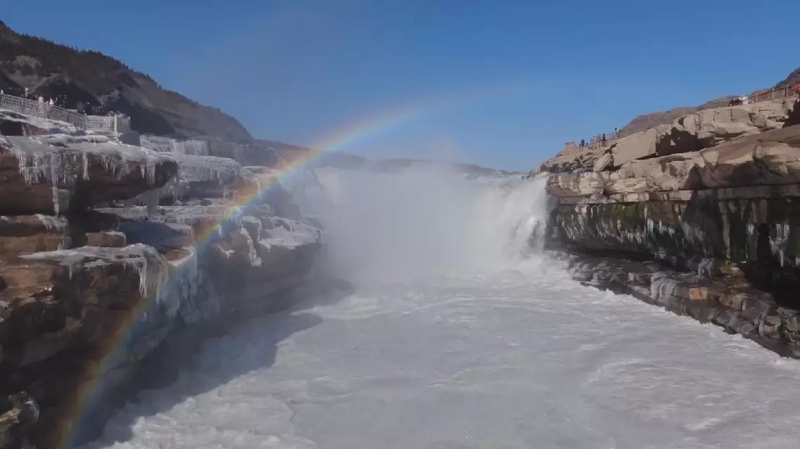 Hukou Waterfall shines with ice, rainbow, clear cascades