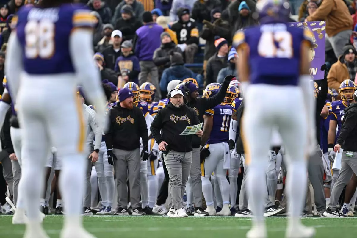 East Carolina head coach Blake Harrell watches the first half of the Military Bowl NCAA college football game Saturday, Dec. 27, 2025, in Annapolis, Md. (AP Photo/Gail Burton)
