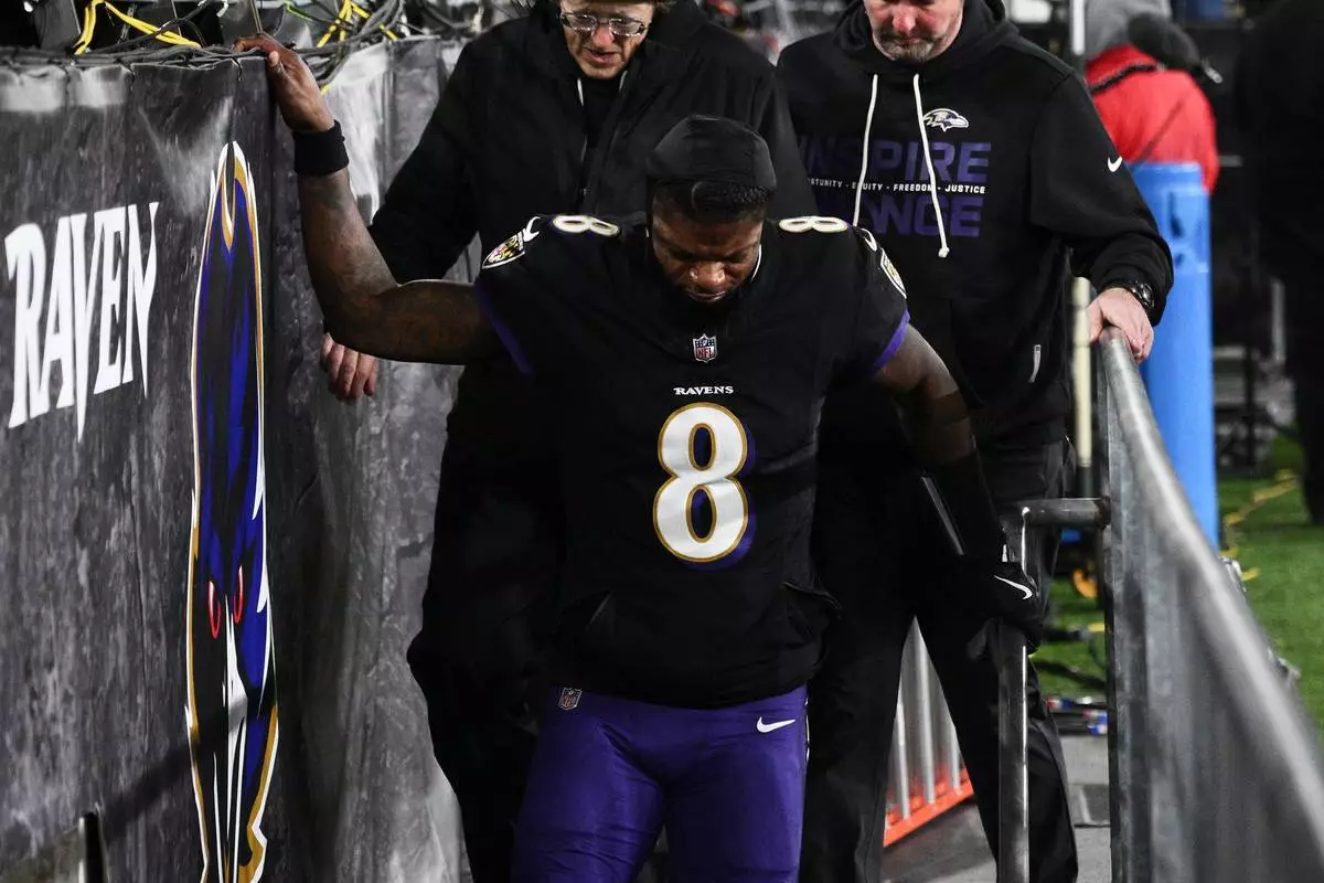 Baltimore Ravens quarterback Lamar Jackson (8) leaves the field during the first half of an NFL football game against the New England Patriots, Sunday, Dec. 21, 2025, in Baltimore. (AP Photo/Nick Wass)