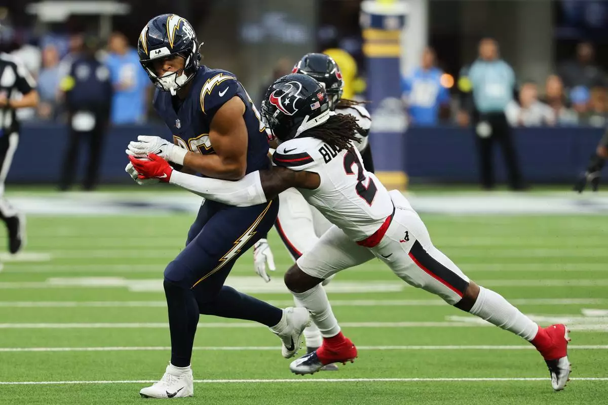 Los Angeles Chargers tight end Oronde Gadsden (86) is grabbed by Houston Texans safety Calen Bullock (2) during the second half of an NFL football game Saturday, Dec. 27, 2025, in Inglewood, Calif. (AP Photo/Kevork Djansezian)