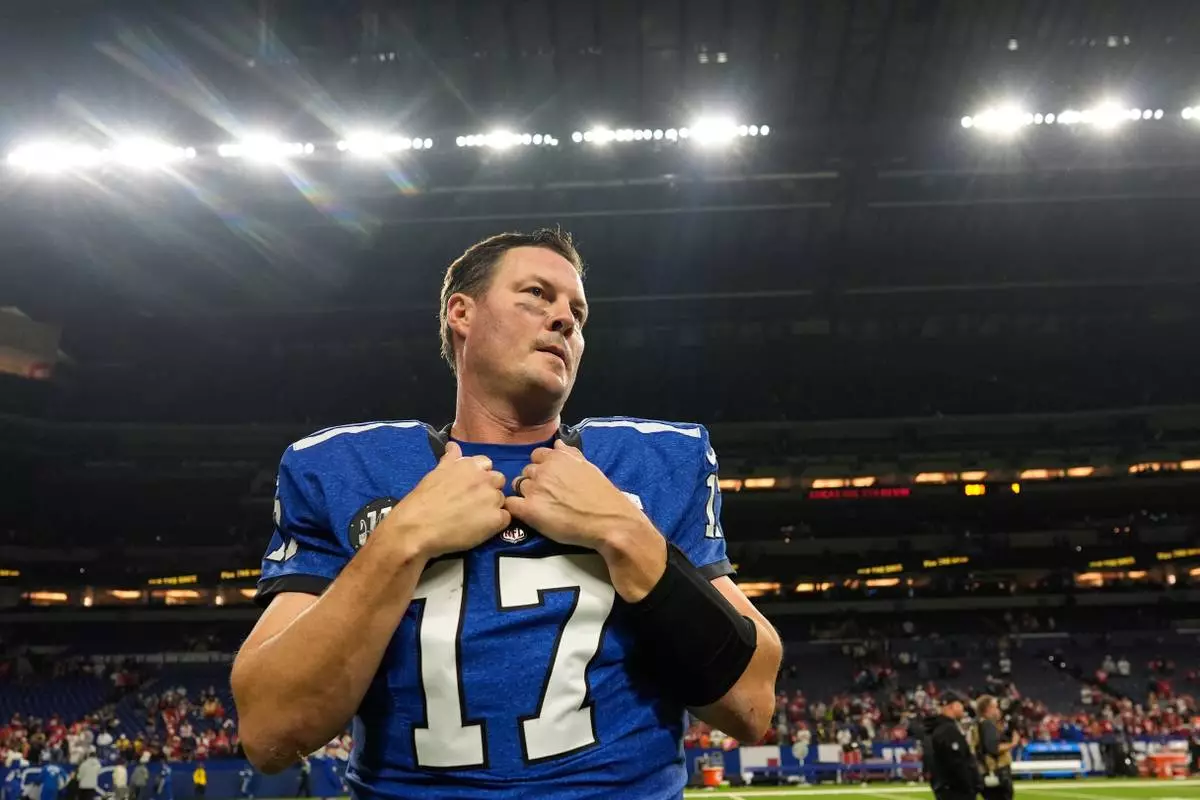 Indianapolis Colts quarterback Philip Rivers (17) stands on the field after an NFL football game against the San Francisco 49ers, Monday, Dec. 22, 2025, in Indianapolis. (AP Photo/Carolyn Kaster)