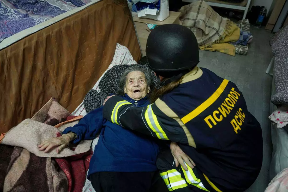 A psychologist of a rescue team helps en elderly woman at the hospice which was damaged after a Russian strike on Kyiv, Ukraine, on Saturday, Dec. 27, 2025. (AP Photo/Evgeniy Maloletka)
