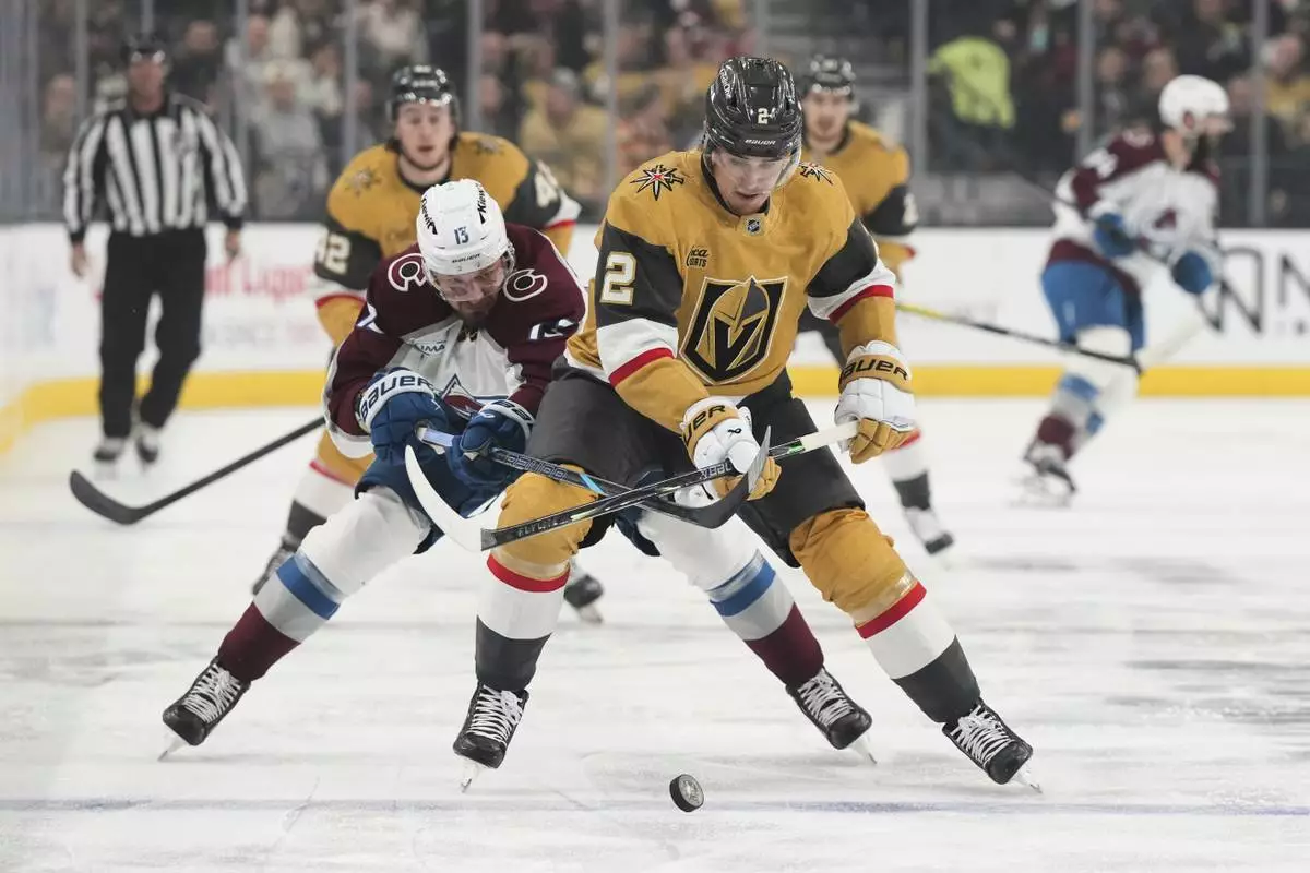 Colorado Avalanche right wing Valeri Nichushkin (13) and Vegas Golden Knights defenseman Zach Whitecloud (2) vie for the puck during the first period of an NHL hockey game Saturday, Dec. 27, 2025, in Las Vegas. (AP Photo/Candice Ward)