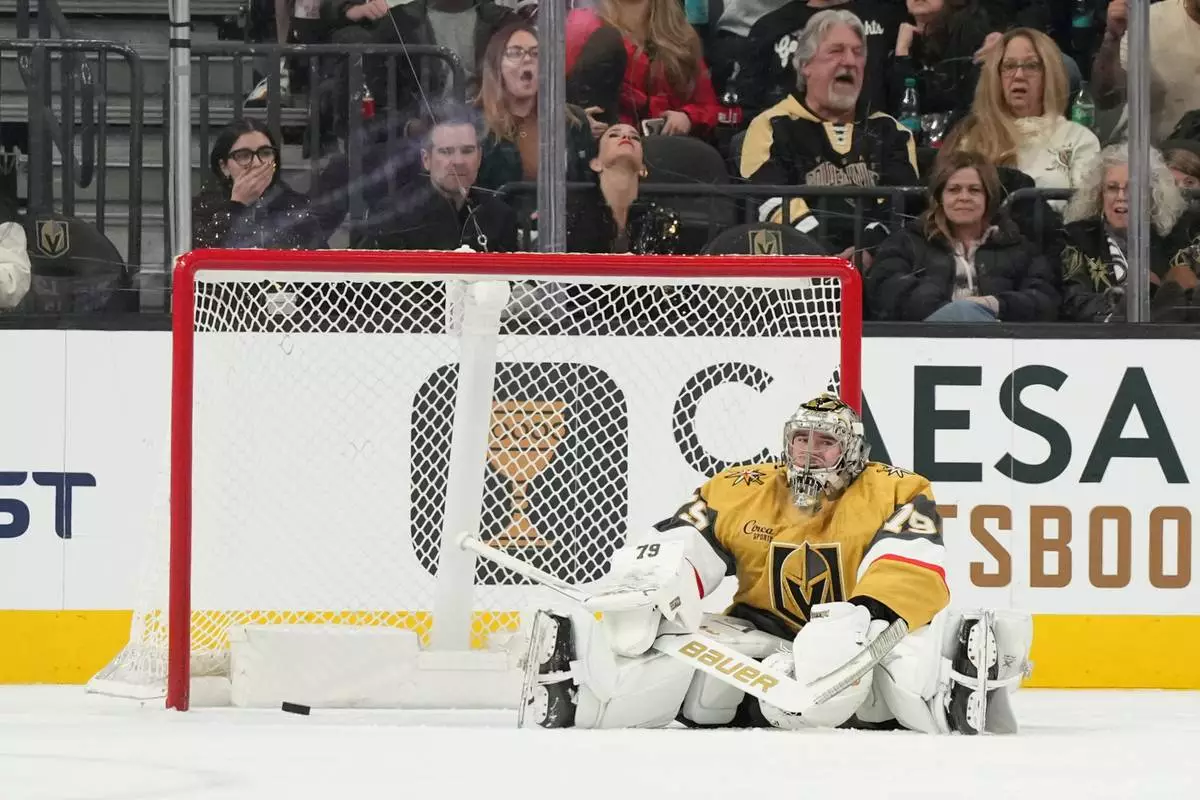 Vegas Golden Knights goaltender Carter Hart reacts to being scored on by Colorado Avalanche center Martin Necas (88) during the second period of an NHL hockey game, Saturday, Dec. 27, 2025, in Las Vegas. (AP Photo/Candice Ward)