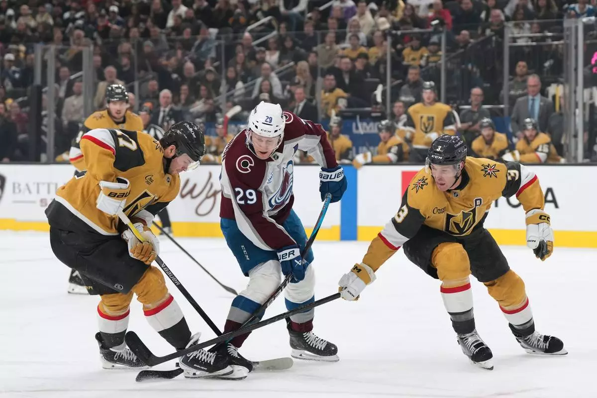 Colorado Avalanche center Nathan MacKinnon (29) skates with the puck against Vegas Golden Knights defensemen Ben Hutton, left, and Brayden McNabb (3) during the first period of an NHL hockey game, Saturday, Dec. 27, 2025, in Las Vegas. (AP Photo/Candice Ward)