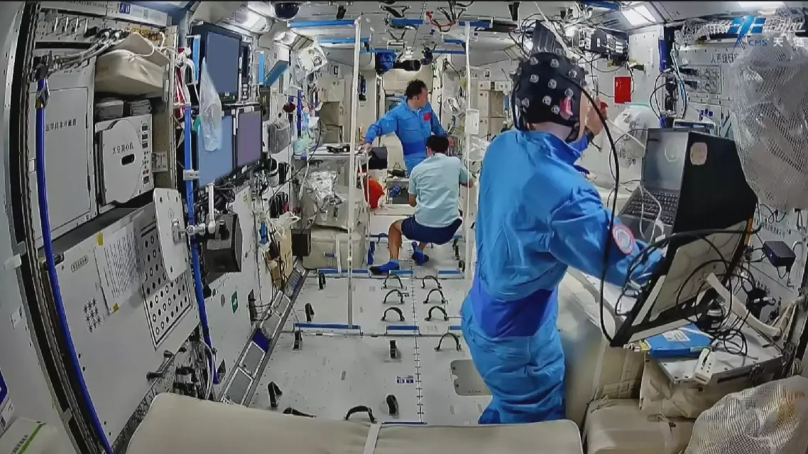 In the field of aerospace medicine experiments, the three astronauts used electroencephalogram (EEG) equipment to acquire data needed for experimental projects such as metacognitive monitoring research and group brain cognition-emotion analysis and regulation, assisting the ground-based researchers in their ongoing research.