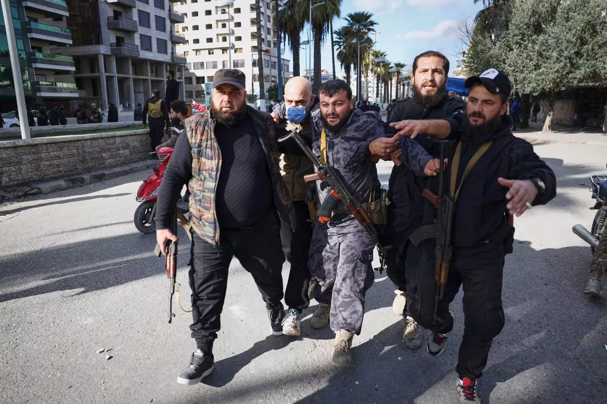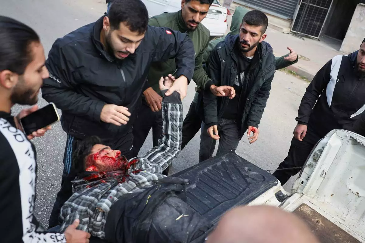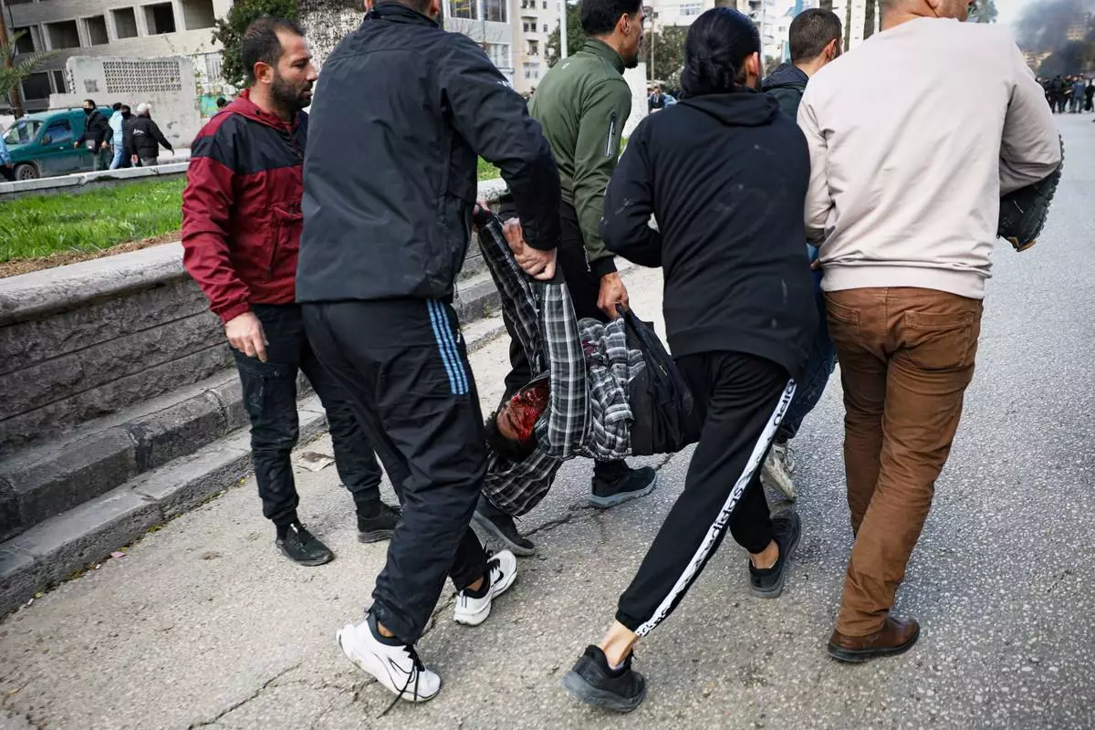 A man seriously injured by a thrown stone is taken away from the area after clashes erupted between Alawite protesters from the Alawite religious minority and counterprotesters, two days after a bomb in an Alawite mosque in Homs killed eight people and wounded 18 during Friday prayers, in Latakia, Syria's coastal region, Sunday, Dec. 28, 2025. (AP Photo/Omar Albam)