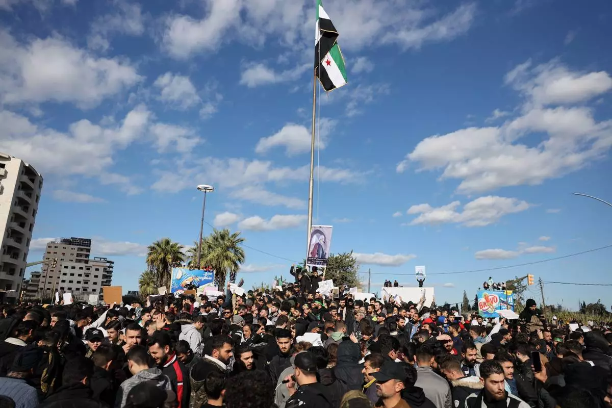 Counter-protesters chant pro-government slogans at Alawite demonstrators, two days after a bomb in an Alawite mosque in Homs killed eight people and wounded 18 during Friday prayers, in Latakia, Syria's coastal region, Sunday, Dec. 28, 2025. (AP Photo/Omar Albam)