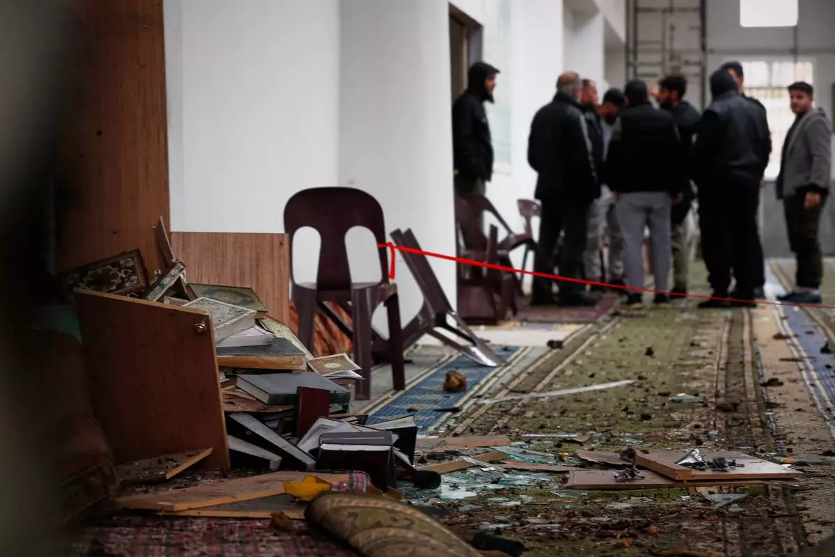 Syrian security officers inspect the site of an attack a day earlier at the Imam Ali bin Abi Talib Mosque in the predominantly Alawite Wadi al-Dhahab neighborhood of Homs, Syria, Saturday, Dec. 27, 2025. (AP Photo/Omar Sanadiki)