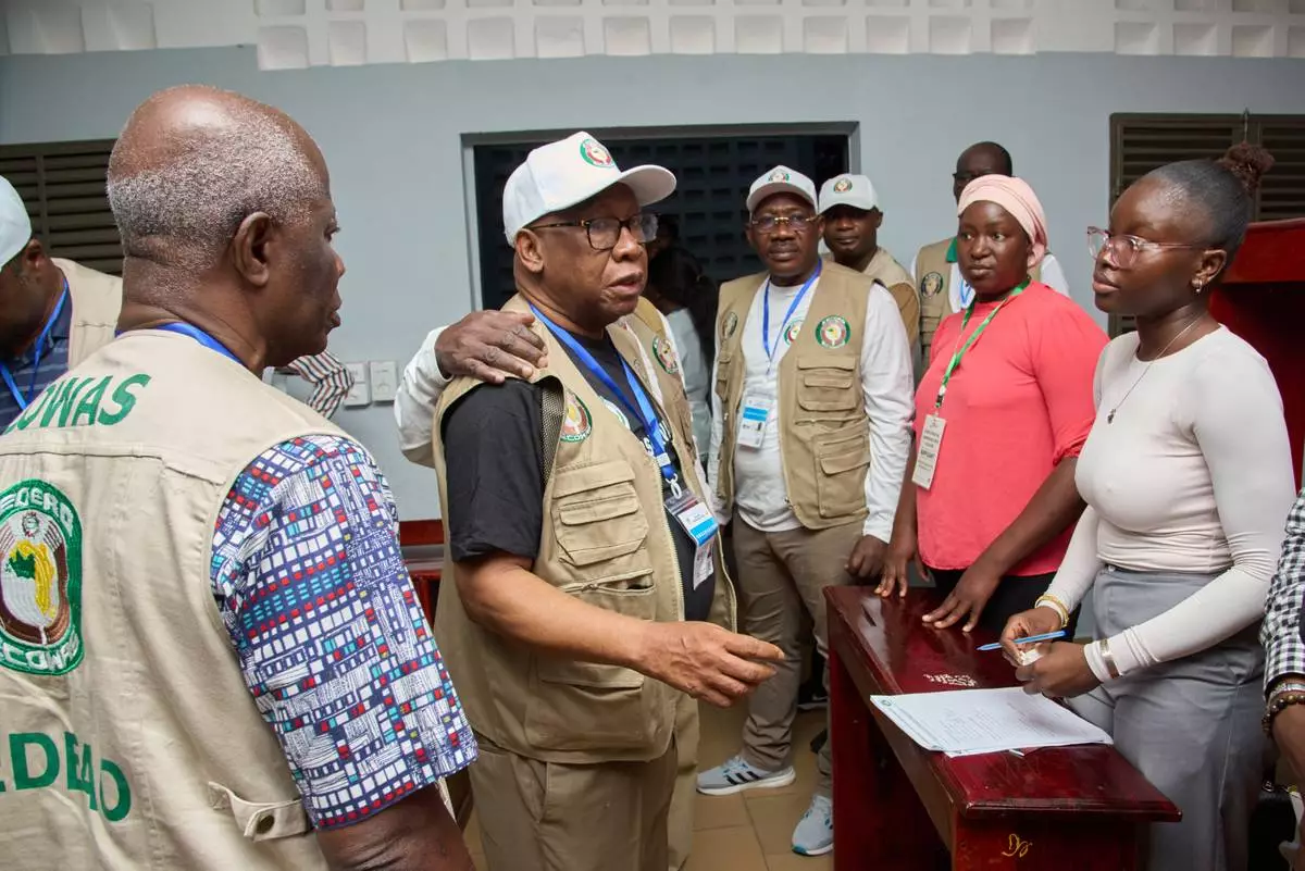 ECOWAS election observers visit a polling station during the presidential election in Conakry, Guinea, Sunday, Dec. 28, 2025. (AP Photo/Fode Toure)