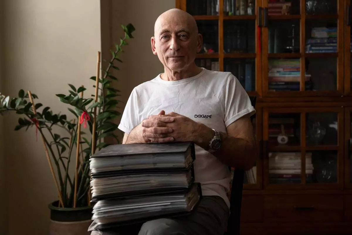 Lev Radin poses for a picture with his MetroCard collection, Dec. 10, 2025, in New York. (AP Photo/Yuki Iwamura)