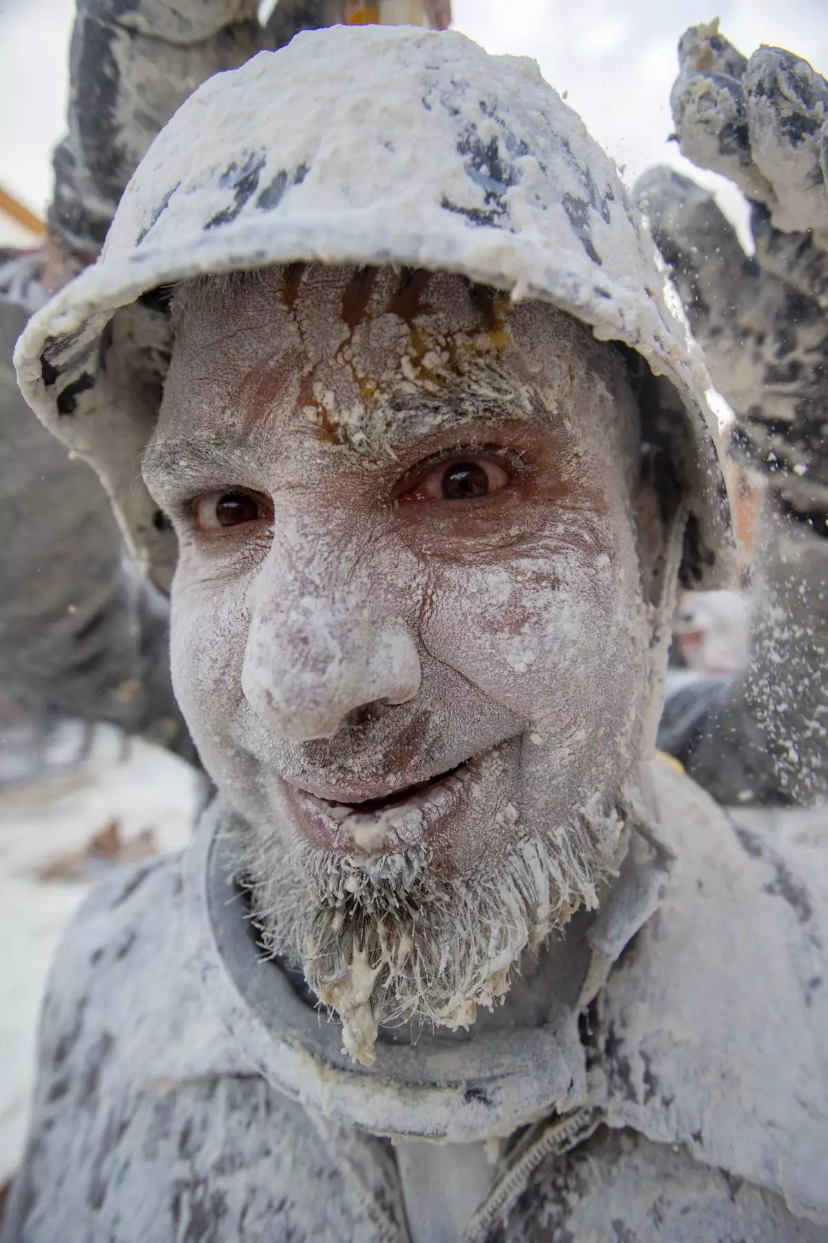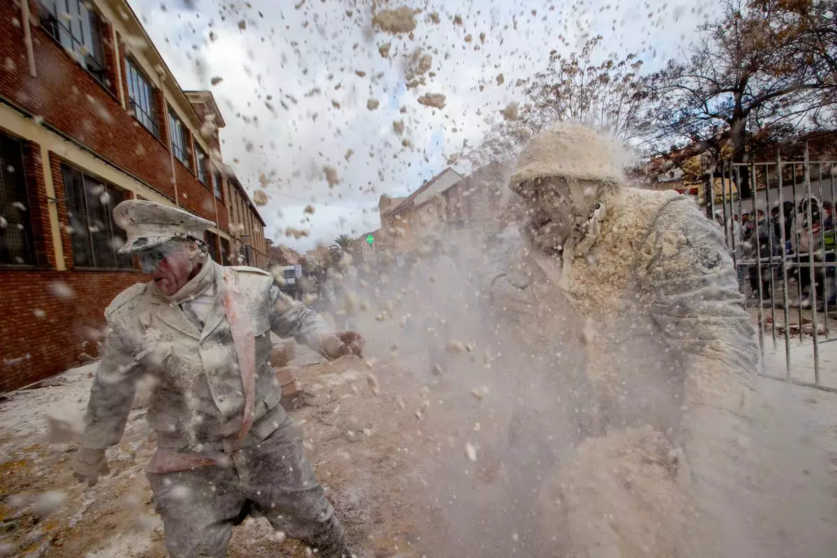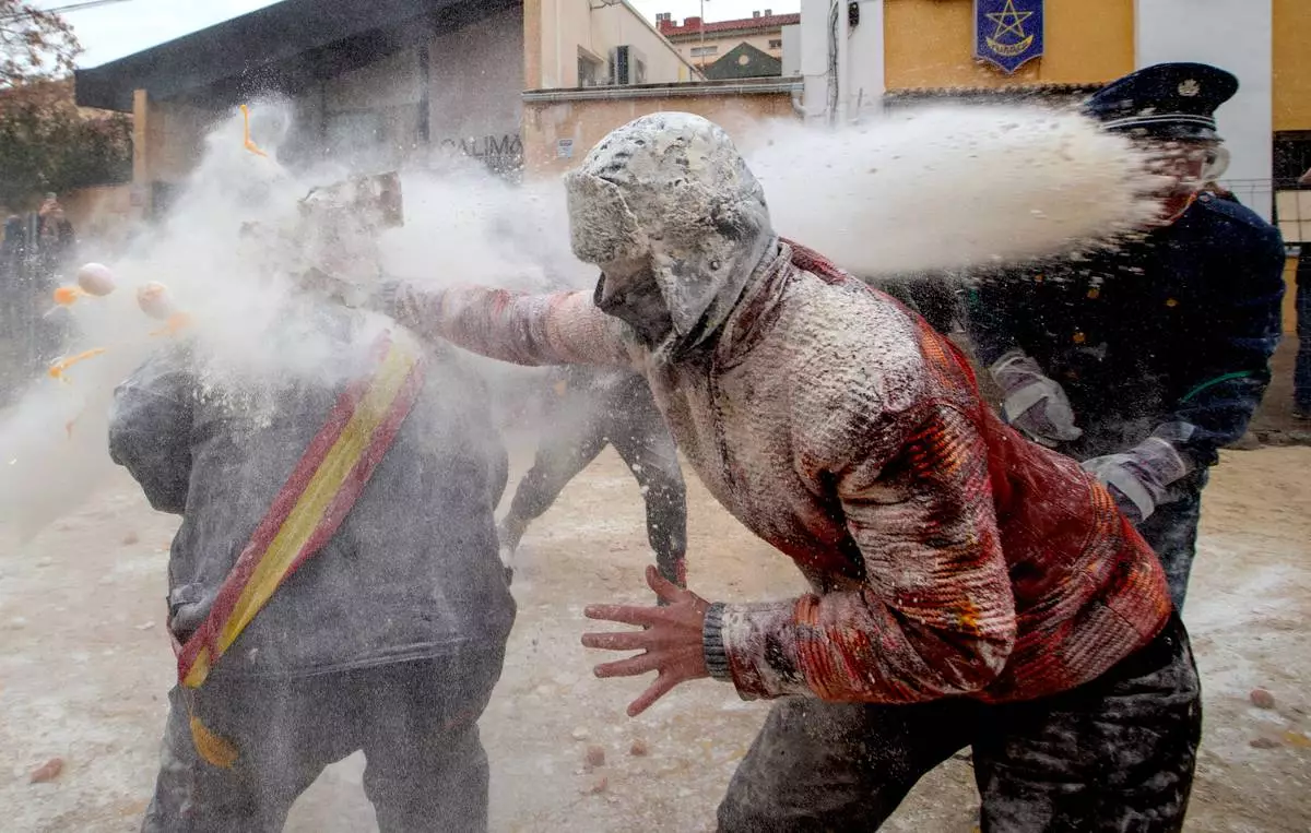 IBI, Spain (AP) — Revelers take part in the Els Enfarinats festival, a battle using flour, eggs and firecrackers in the Spanish town of Ibi.