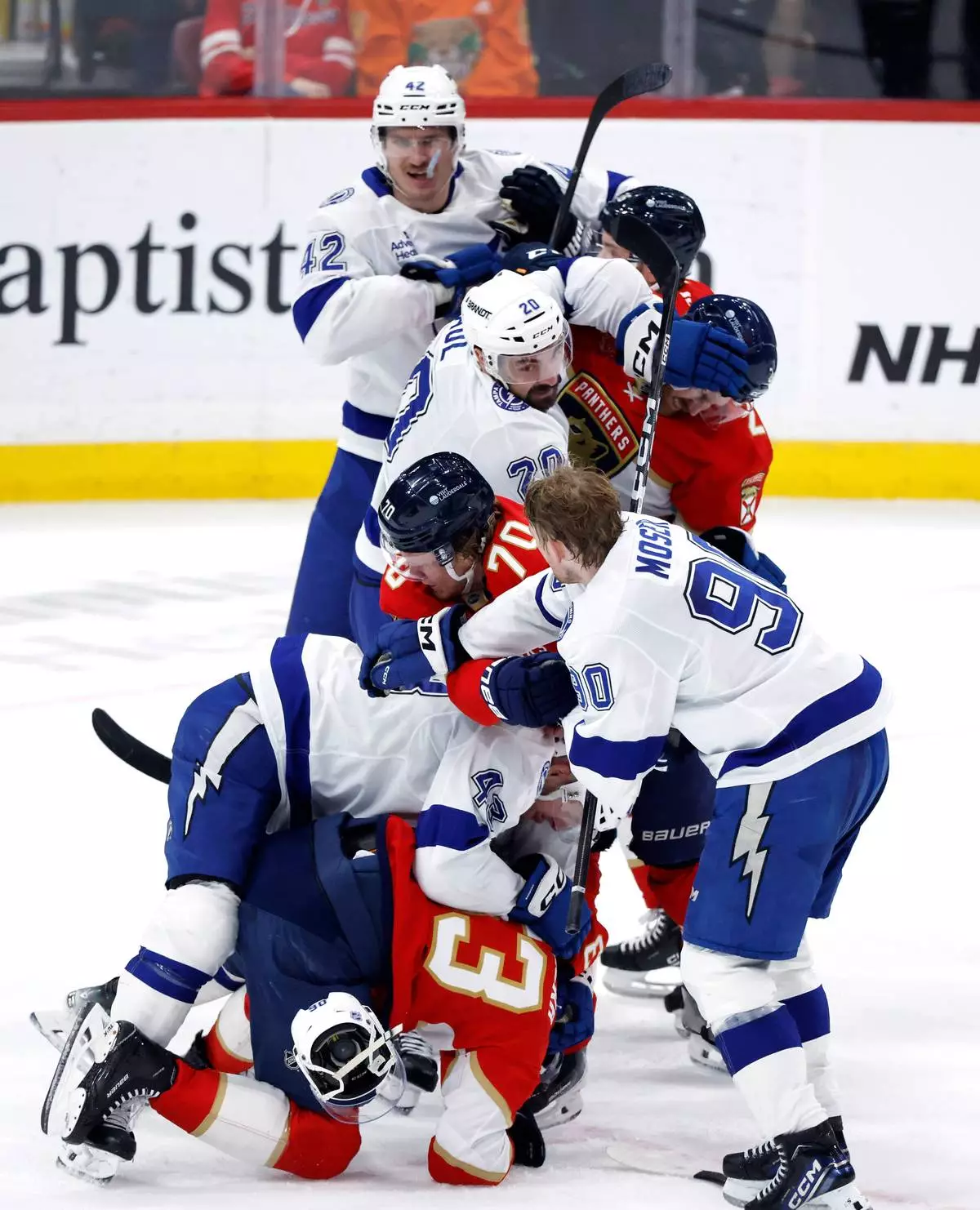 FORT LAUDERDALE, Fla. (AP) — The NHL fined Florida's Anton Lundell and Tampa Bay's Scott Sabourin for their actions in the game between the Panthers and Lightning on Saturday night, one where the teams combined for the highest penalty total the league has seen since 2011.