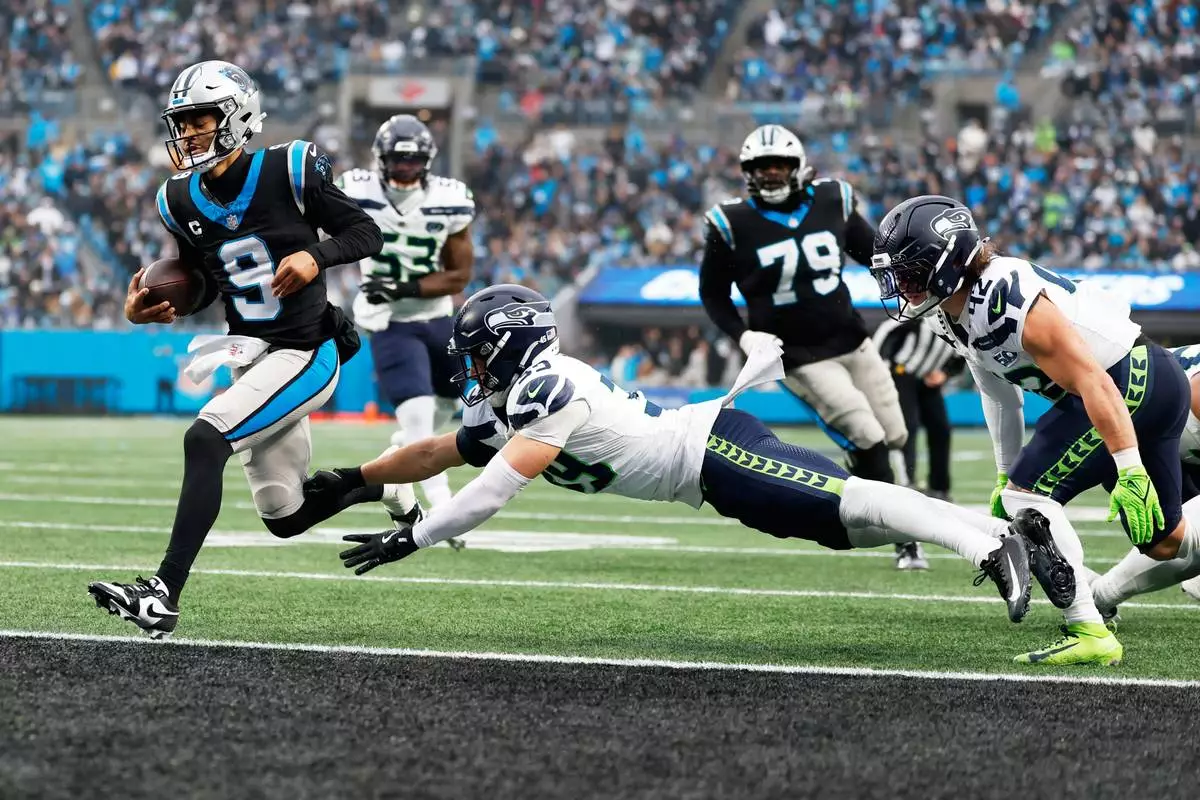 Carolina Panthers quarterback Bryce Young scores past Seattle Seahawks safety Ty Okada during the second half of an NFL football game, Sunday, Dec. 28, 2025, in Charlotte, N.C. (AP Photo/Rusty Jones)