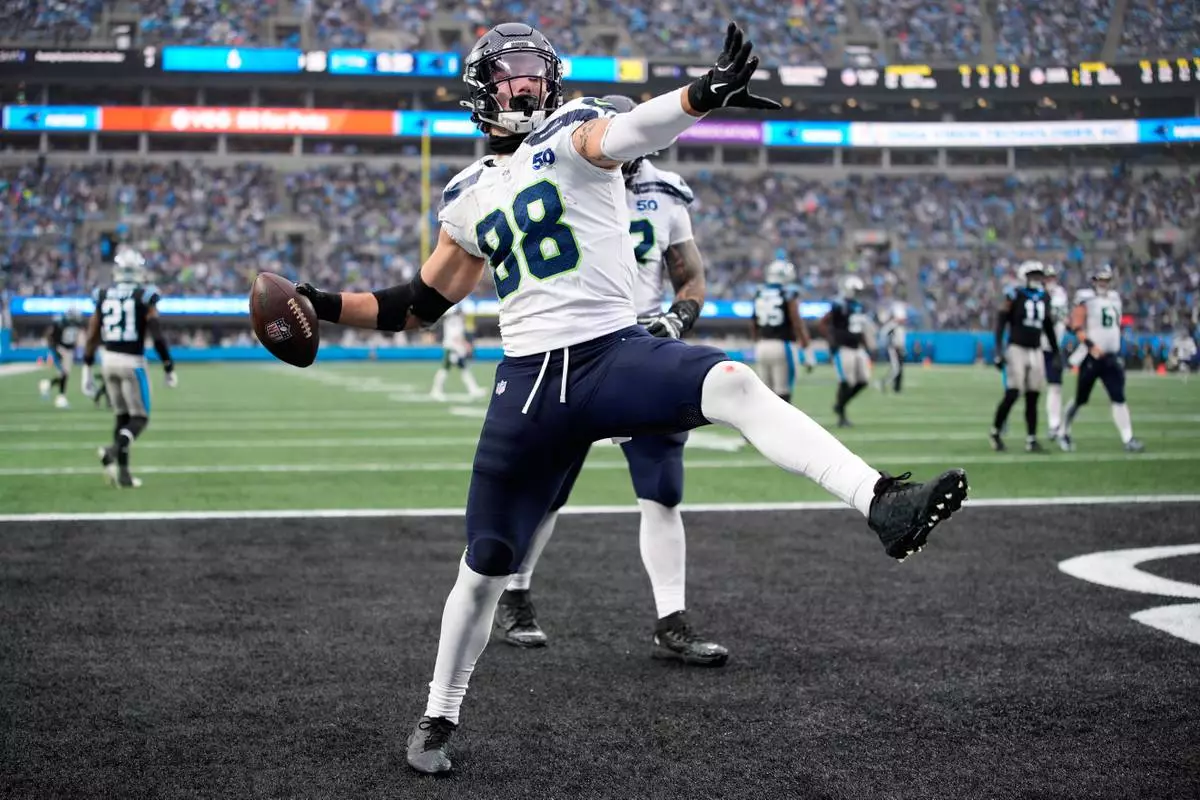 Seattle Seahawks tight end AJ Barner celebrates after scoring against the Carolina Panthers during the second half of an NFL football game, Sunday, Dec. 28, 2025, in Charlotte, N.C. (AP Photo/Jacob Kupferman)