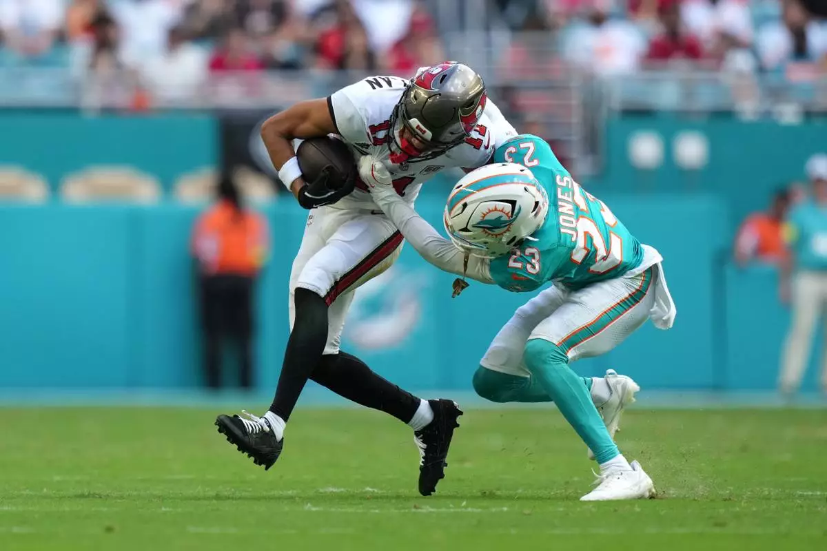 Miami Dolphins cornerback Jack Jones (23) tackles Tampa Bay Buccaneers wide receiver Jalen McMillan (11) during the first half of an NFL football game Sunday, Dec. 28, 2025, in Miami Gardens, Fla. (AP Photo/Lynne Sladky)