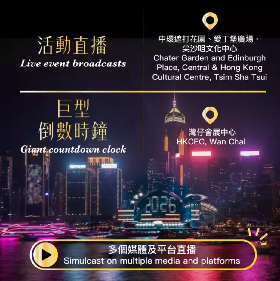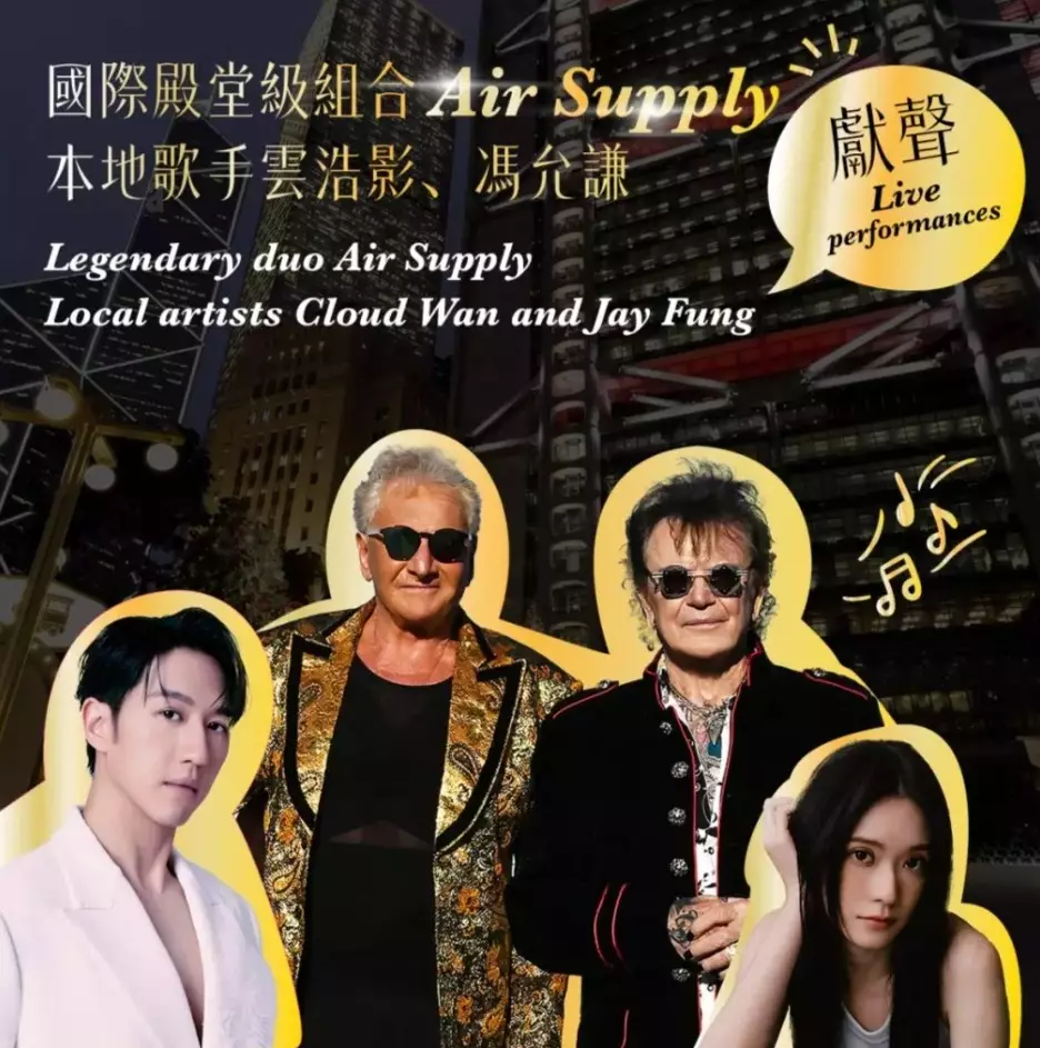The 2025-2026 New Year Countdown will take place at the Chater Road Pedestrian Precinct in Central, from 11:28 pm-12:10 am on New Year's Eve. Featured performers include local artists Jay Fung and Cloud Wan, as well as the internationally acclaimed group Air Supply, will deliver a special performance of their timeless classic hits. Besides, stunning light shows will also share positive energy and heartfelt blessings with on-site and global audiences.