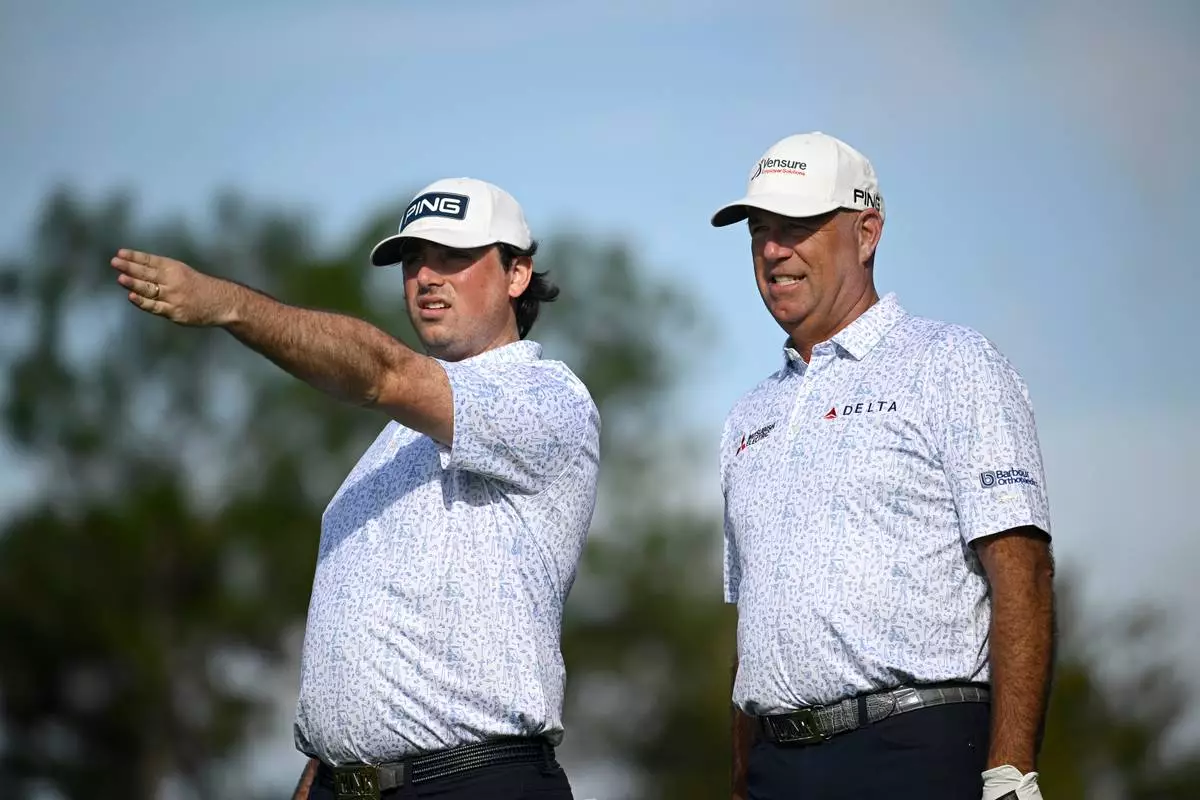 Stewart Cink, right, and his son Reagan Cink, discuss a tee shot on the second hole during the final round of the PNC Championship golf tournament, Sunday, Dec. 21, 2025, in Orlando, Fla. (AP Photo/Phelan M. Ebenhack)