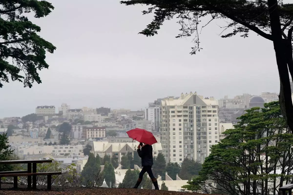 FILE - A woman carries an umbrella while walking at Alamo Square Park in San Francisco, Nov. 9, 2021. (AP Photo/Jeff Chiu, File)