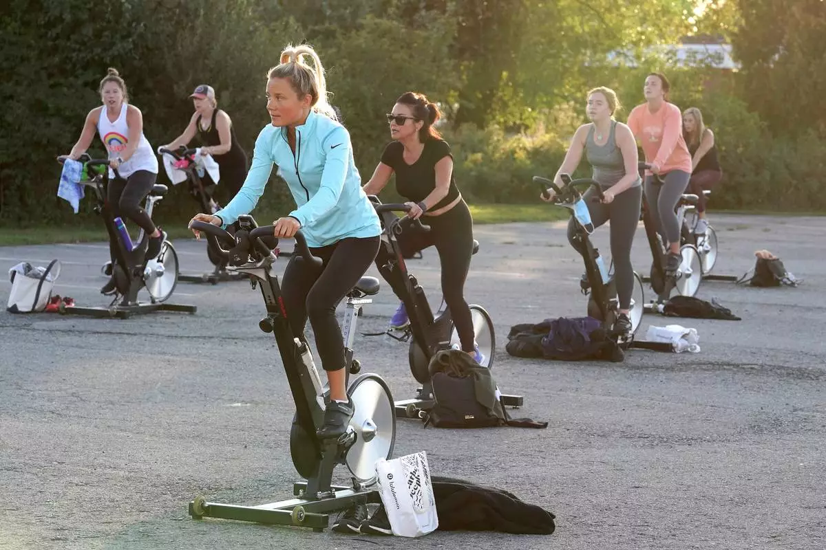 FILE - Jackie Brennan, of Merrimac, Mass., front, pedals on a stationary exercise bike with others during a spinning class in a parking lot outside Fuel Training Studio,Sept. 21, 2020, in Newburyport. (AP Photo/Steven Senne, File)