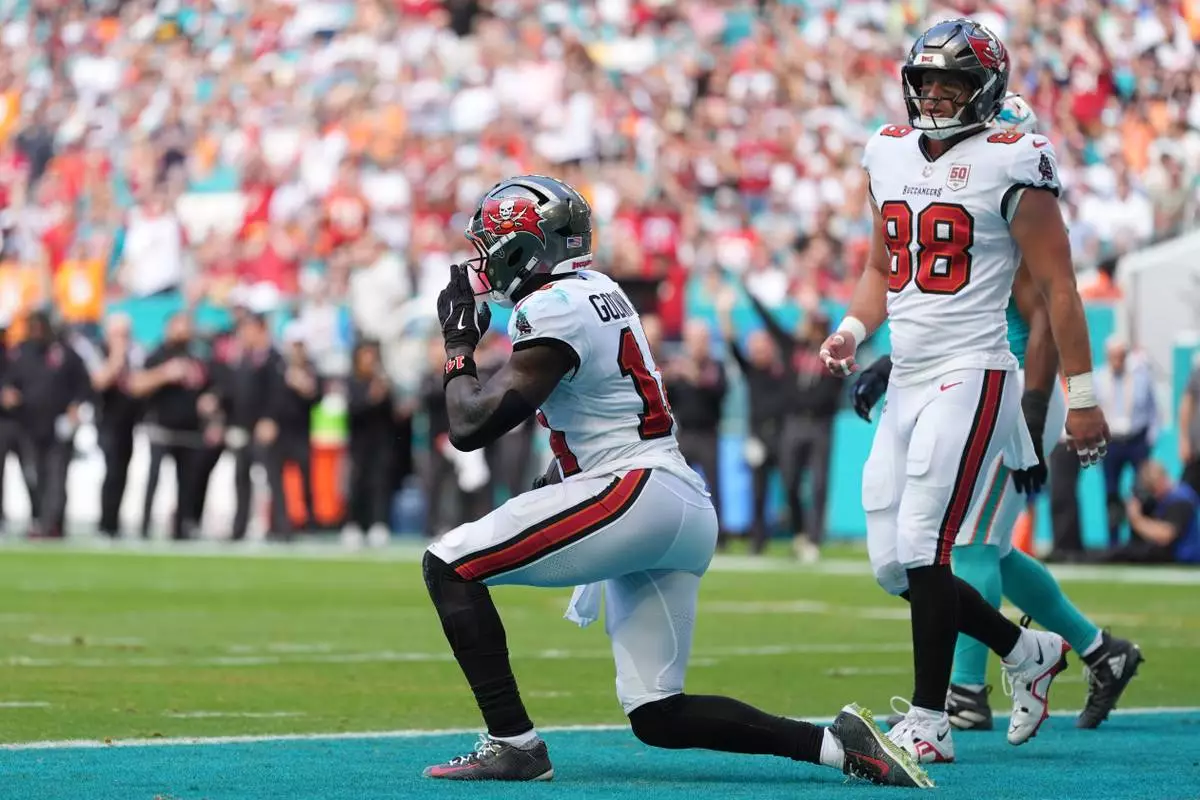 Tampa Bay Buccaneers wide receiver Chris Godwin Jr. (14) celebrates after scoring a touchdown against the Miami Dolphins during the first half of an NFL football game Sunday, Dec. 28, 2025, in Miami Gardens, Fla. (AP Photo/Rebecca Blackwell)