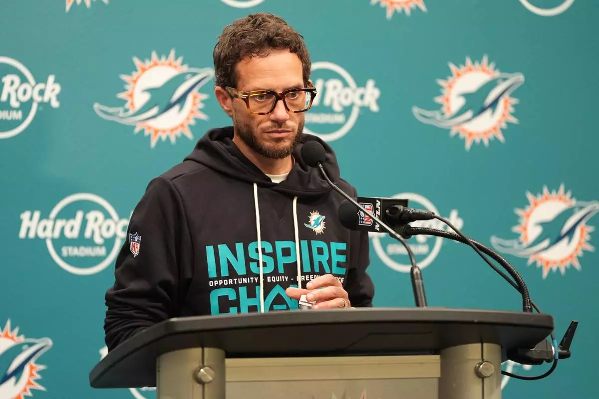Miami Dolphins head coach Mike McDaniel speaks during a news conference after an NFL football game against the Tampa Bay Buccaneers, Sunday, Dec. 28, 2025, in Miami Gardens, Fla. (AP Photo/Rebecca Blackwell)