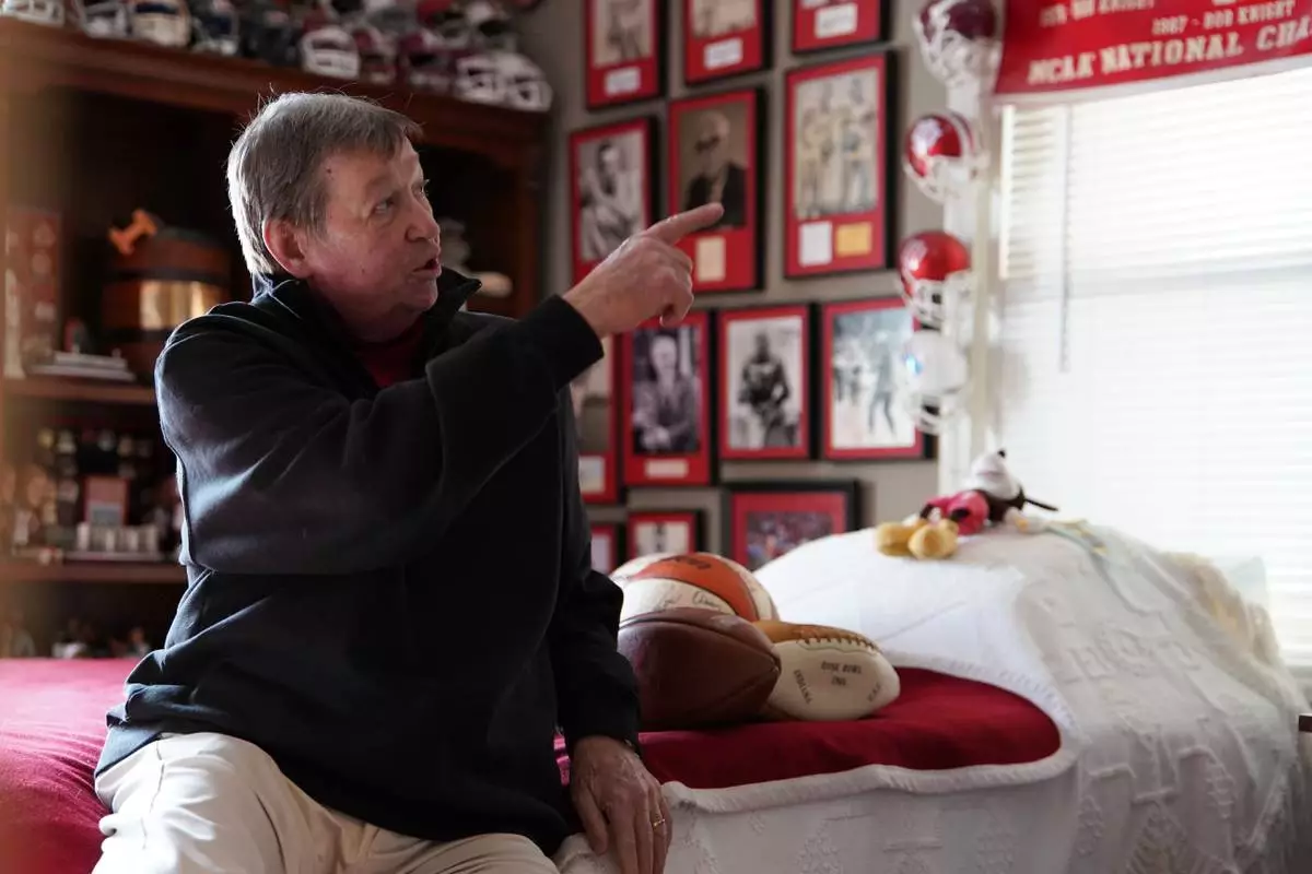 Bill Murphy sits on a bed and looks at memorabilia hanging on the wall in a room at his home in Greenfield, Ind., on Wednesday, Dec. 17, 2025. (AP Photo/Obed Lamy)