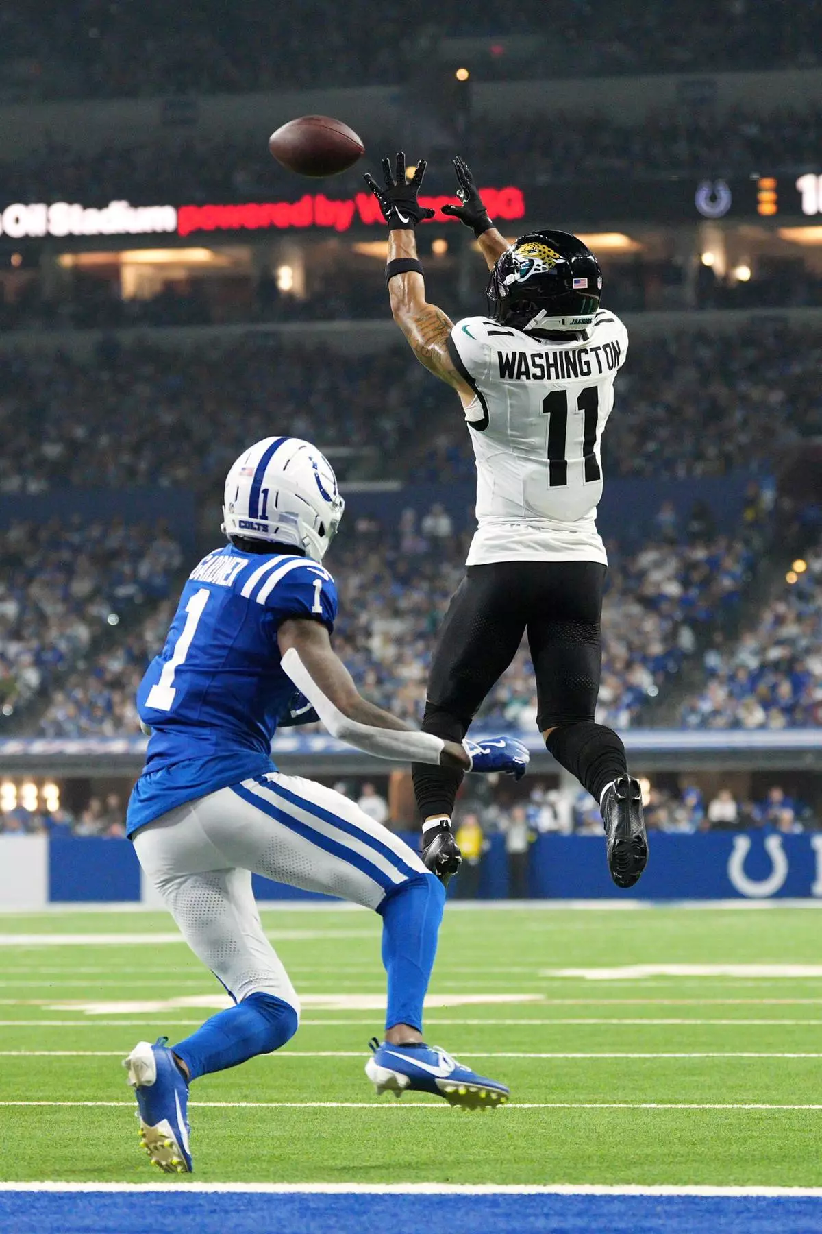 Jacksonville Jaguars wide receiver Parker Washington (11) catches a pass as Indianapolis Colts cornerback Sauce Gardner (1) defends during the first half of an NFL football game Sunday, Dec. 28, 2025, in Indianapolis. (AP Photo/AJ Mast)