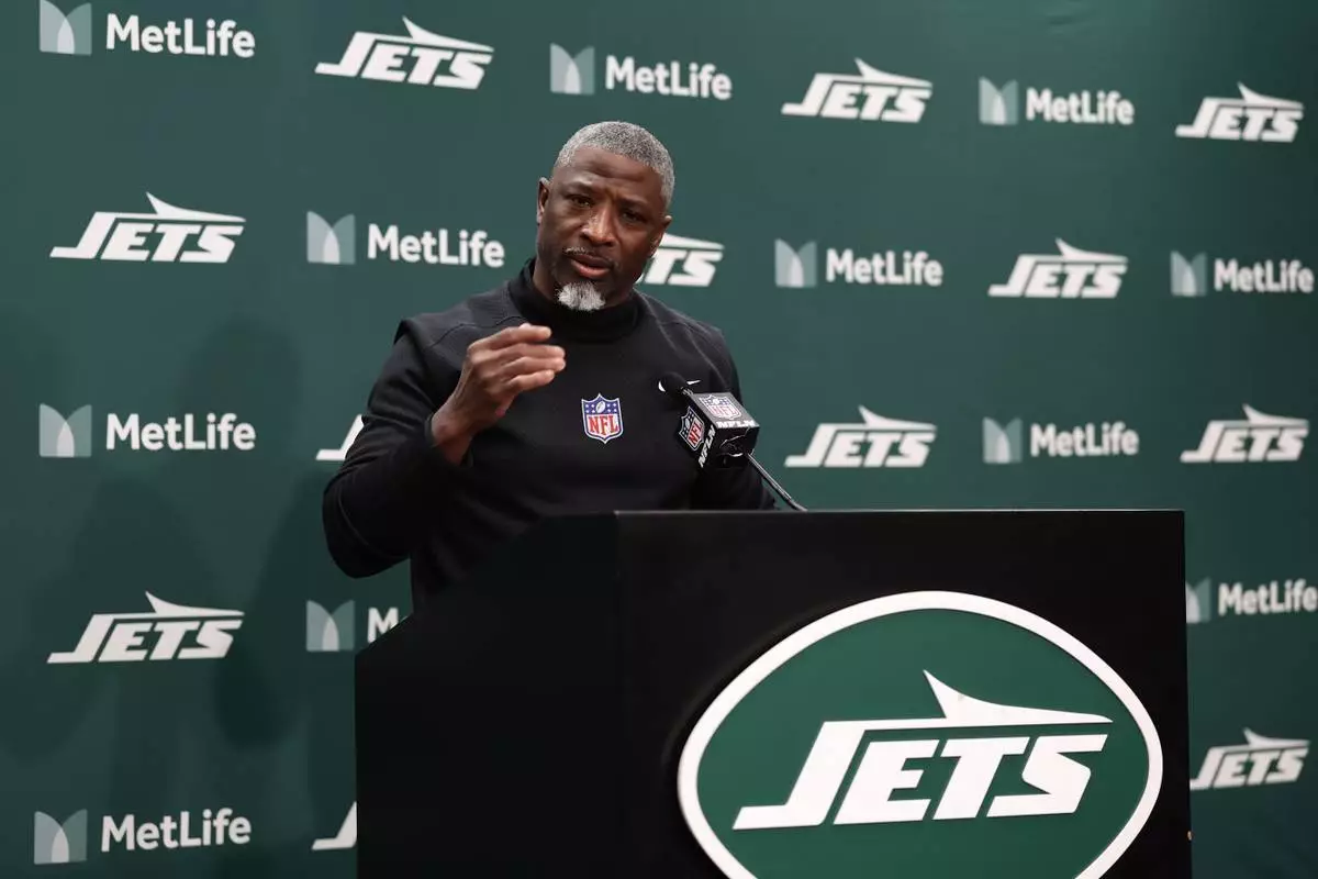 New York Jets head coach Aaron Glenn talks to the media during a news conference following a loss to the New England Patriots in an NFL football game, Sunday, Dec. 28, 2025, in East Rutherford, N.J. (AP Photo/Adam Hunger)