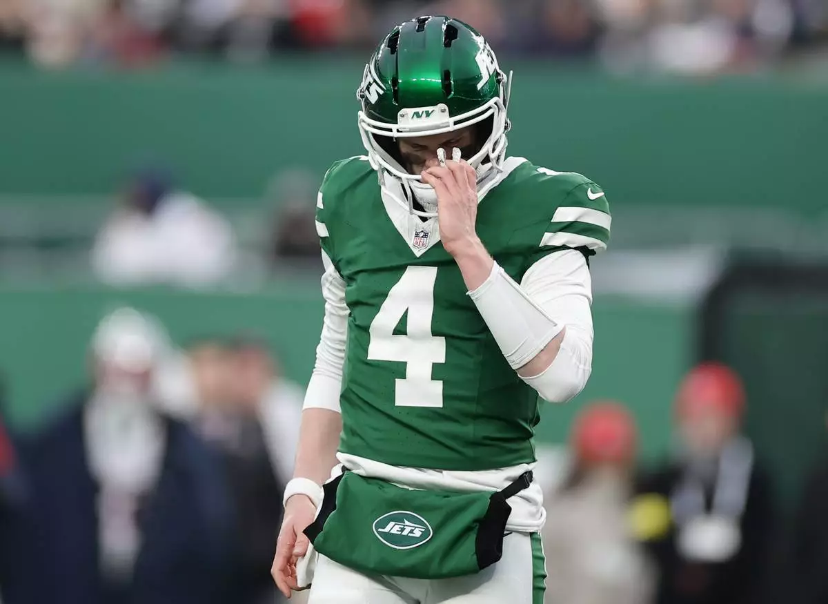 New York Jets quarterback Brady Cook reacts during the second half of an NFL football game against the New England Patriots, Sunday, Dec. 28, 2025, in East Rutherford, N.J. (AP Photo/Adam Hunger)