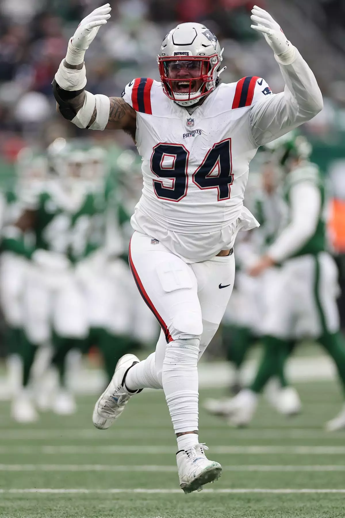 New England Patriots defensive tackle Cory Durden reacts during the second half of an NFL football game against the New York Jets, Sunday, Dec. 28, 2025, in East Rutherford, N.J. (AP Photo/Adam Hunger)
