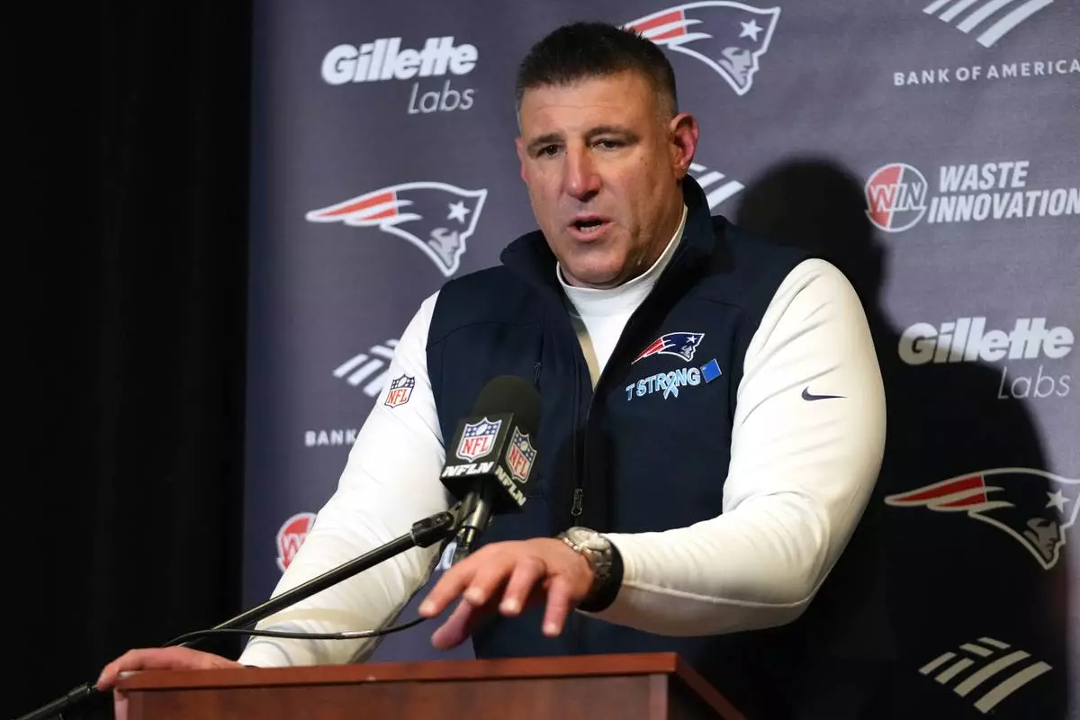New England Patriots head coach Mike Vrabel talks during a news conference after is team defeated the New York Jets in an NFL football game, Sunday, Dec. 28, 2025, in East Rutherford, N.J. (AP Photo/Frank Franklin)