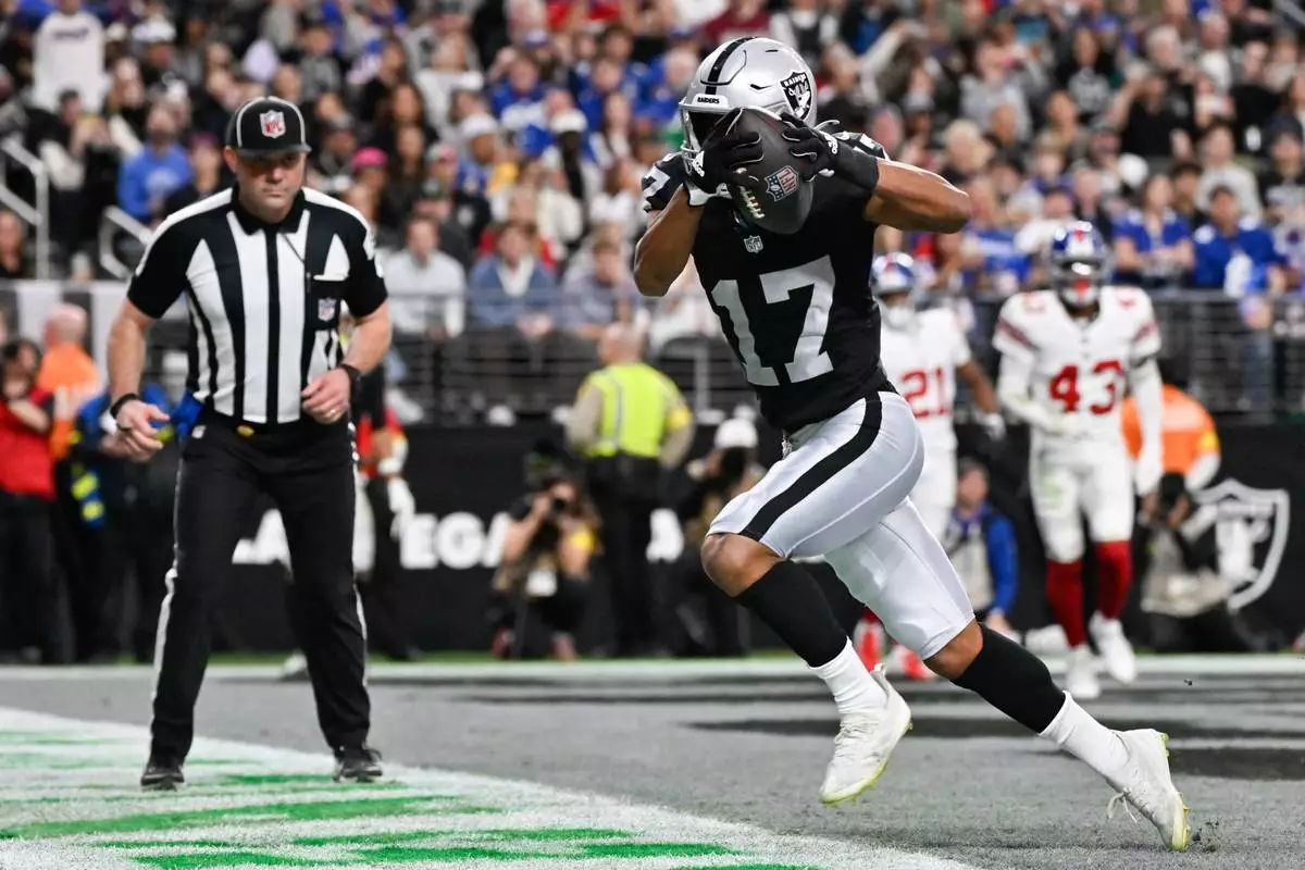 Las Vegas Raiders wide receiver Tyler Lockett (17) scores a touchdown during the second half of an NFL football game against the New York Giants Sunday, Dec. 28, 2025, in Las Vegas. (AP Photo/David Becker)