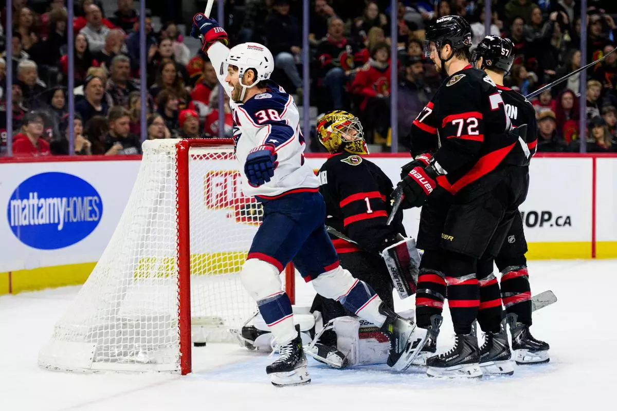 Columbus Blue Jackets' Boone Jenner (38) celebrates his goal on Ottawa Senators goaltender Leevi Merilainen (1) during the first period of an NHL hockey game, in Ottawa, Ontario, Monday, Dec. 29, 2025. (Spencer Colby/The Canadian Press via AP)