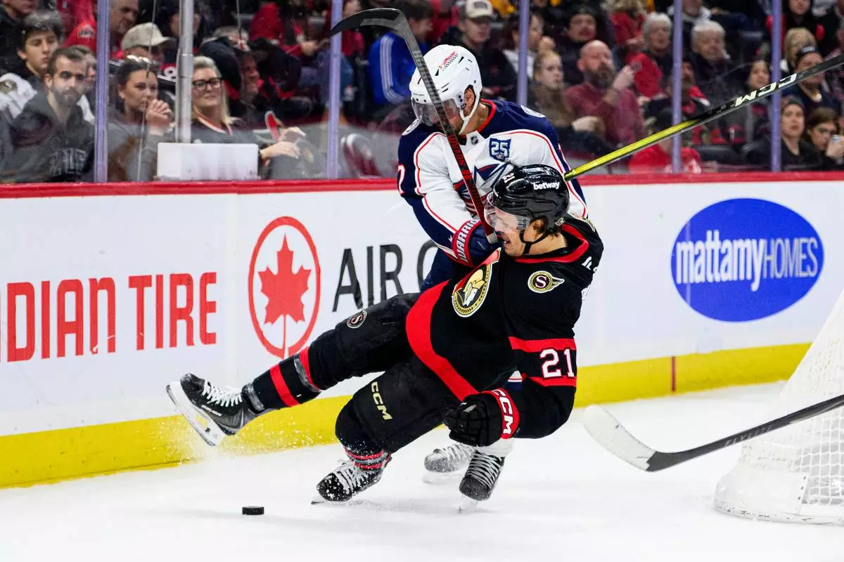 Ottawa Senators' Dylan Cozens (24) battles for possession of the puck against Columbus Blue Jackets' Denton Mateychuk (5) during the third period of an NHL hockey game in Ottawa, Monday, Dec. 29, 2025. (Spencer Colby/The Canadian Press via AP)