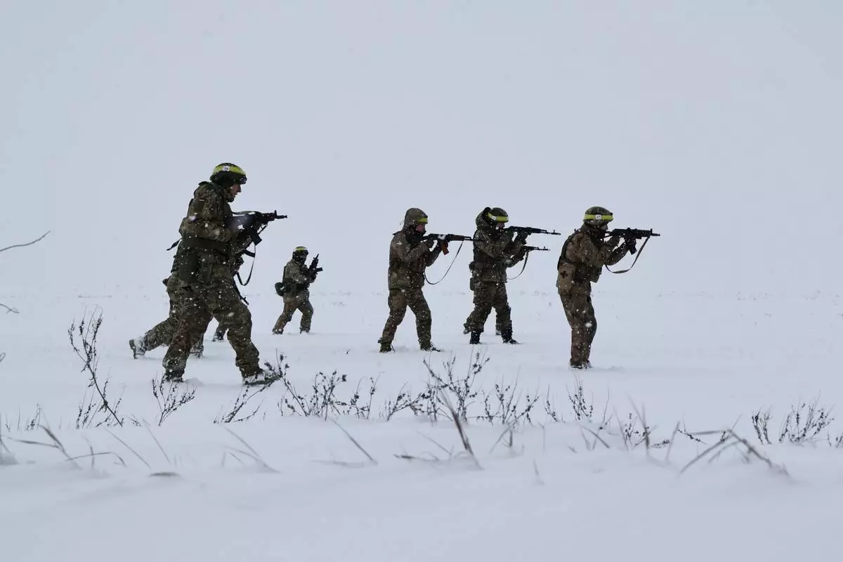 In this photo provided by Ukraine's 65th Mechanized Brigade press service, recruits attend drills at a training ground in the Zaporizhzhia region, Ukraine, Monday, Dec. 29, 2025. (Andriy Andriyenko/Ukraine's 65th Mechanized Brigade via AP)