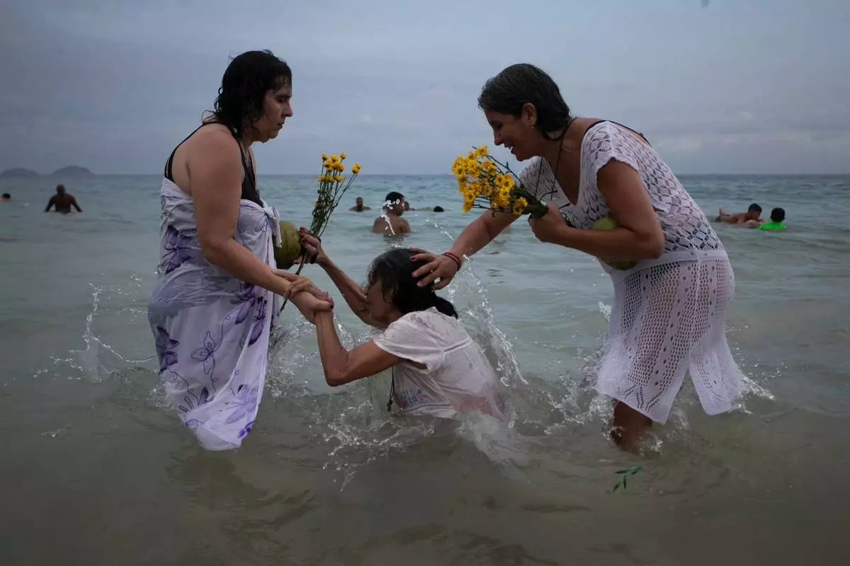 People pray on Copacabana Beach during a ceremony honoring Yemanja, the sea goddess of the Yoruba religion, in Rio de Janeiro, Monday, Dec. 29, 2025. (AP Photo/Bruna Prado)