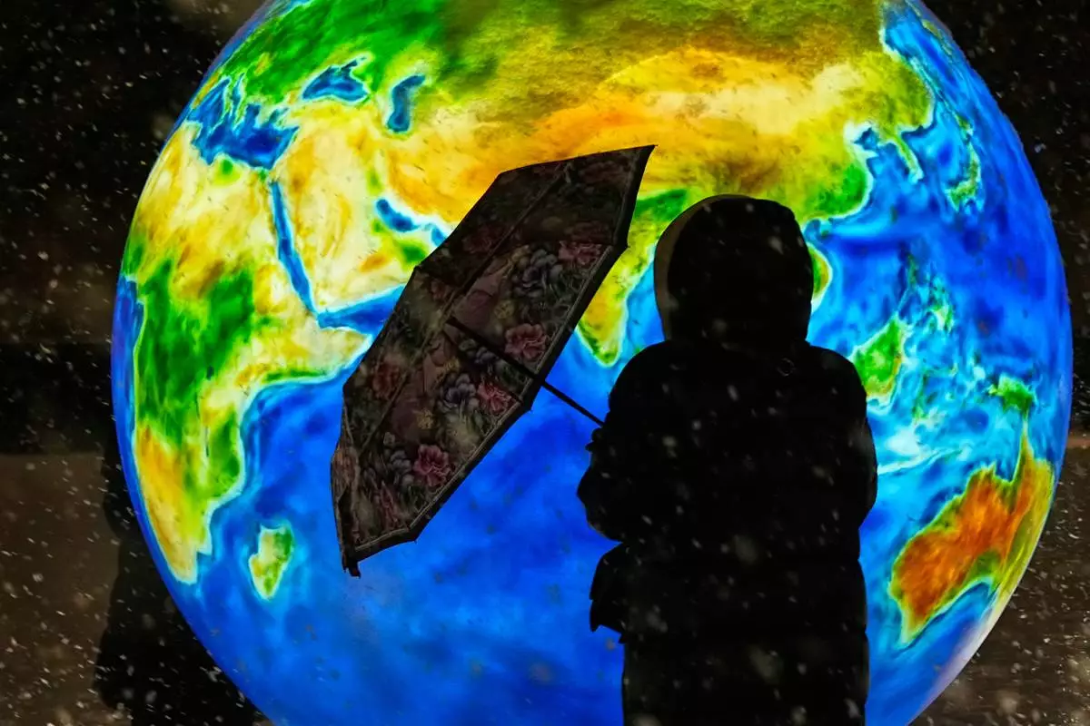 A woman stands next to a glowing ball depicting the Earth at a square decorated prior to Christmas and New Year festivities, during snowfall in St. Petersburg, Russia, Tuesday, Dec. 30, 2025. (AP Photo/Dmitri Lovetsky)