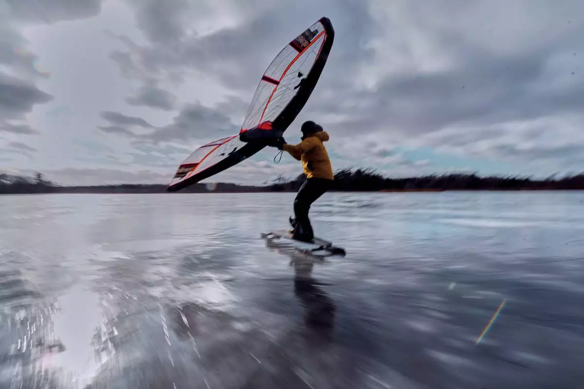 Alex Sutula, of South Portland, Maine, wingskates across frozen Great Pond on a skateboard modified with metal blades, Tuesday, Dec. 30, 2025, in Cape Elizabeth, Maine. (AP Photo/Robert F. Bukaty)