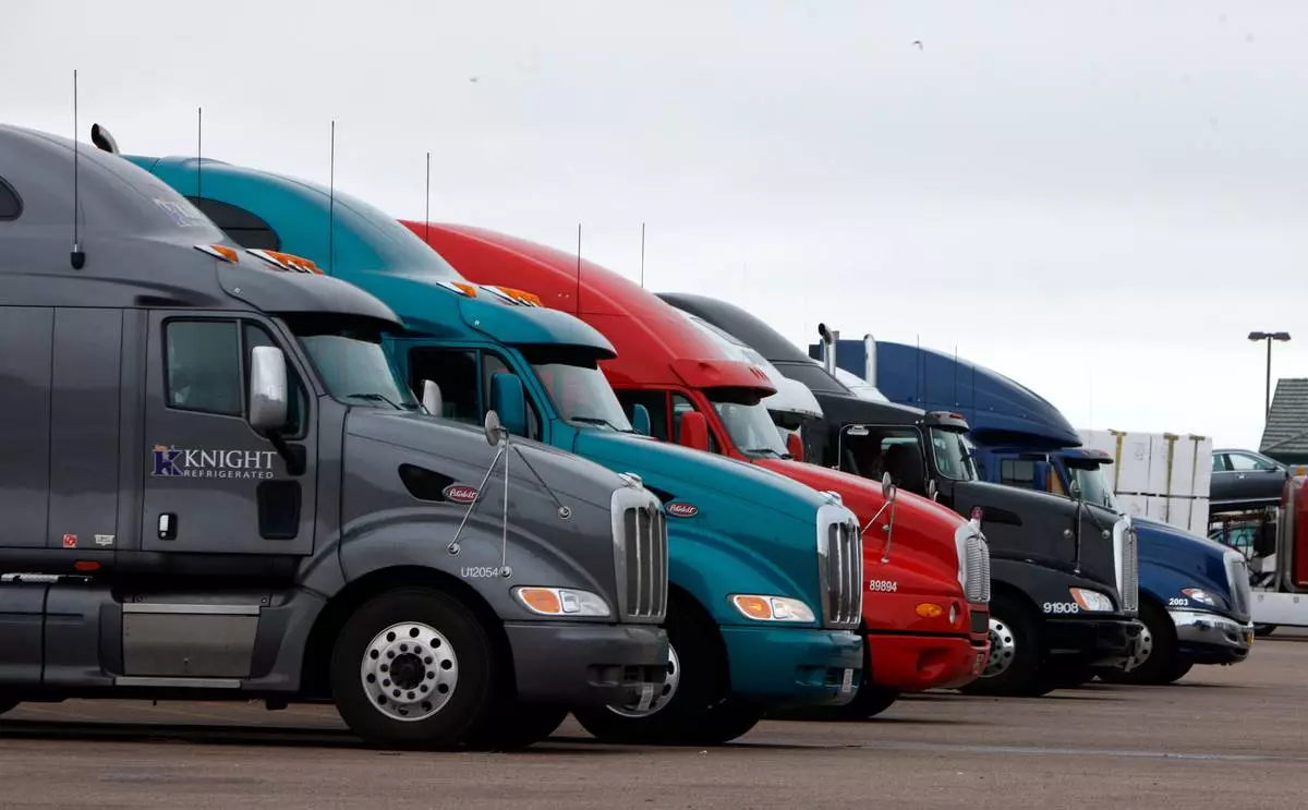 FILE - Big rigs stack up at the Flying J Truck Stop along Interstate 70 near the small Colorado plains community of Limon, May 21, 2009. (AP Photo/David Zalubowski, File)