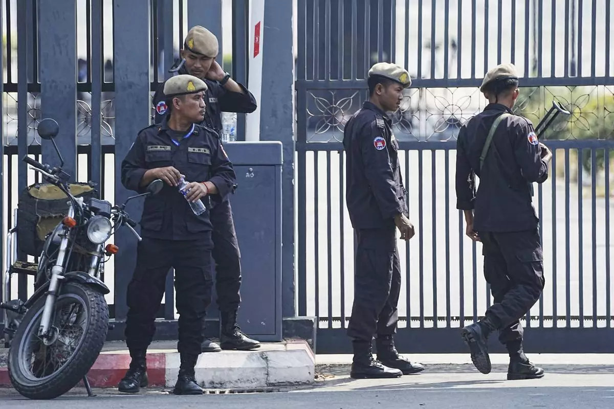 Cambodian police officers stand guard as they wait for 18 soldiers released after being captured and held by the Thai army, at former Phnom Penh International Airport in Phnom Penh, Cambodia, Wednesday, Dec. 31, 2025. (AP Photo/Heng Sinith)